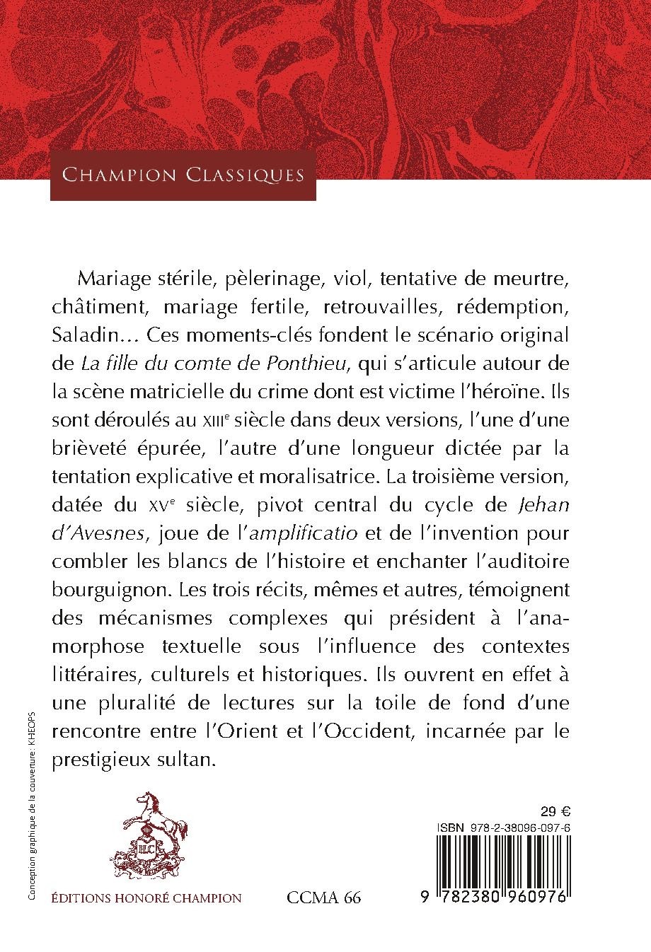 Mariage stérile, pèlerinage, viol, tentative de meurtre, châtiment, mariage fertile, retrouvailles, rédemption, Saladin… Ces moments-clés fondent le scénario original de La fille du comte de Ponthieu, qui s’articule autour de la scène matricielle du crime dont est victime l’héroïne. Ils sont déroulés au XIIIe siècle dans deux versions, l’une d’une brièveté épurée, l’autre d’une longueur dictée par la tentation explicative et moralisatrice. La troisième version, datée du XVe siècle, pivot central du cycle de Jehan d’Avesnes, joue de l’amplificatio et de l’invention pour combler les blancs de l’histoire et enchanter l’auditoire bourguignon. Les trois récits, mêmes et autres, témoignent des mécanismes complexes qui président à l’anamorphose textuelle sous l’influence des contextes littéraires, culturels et historiques. Ils ouvrent en effet à une pluralité de lectures sur la toile de fond d’une rencontre entre l’Orient et l’Occident, incarnée par le prestigieux sultan.