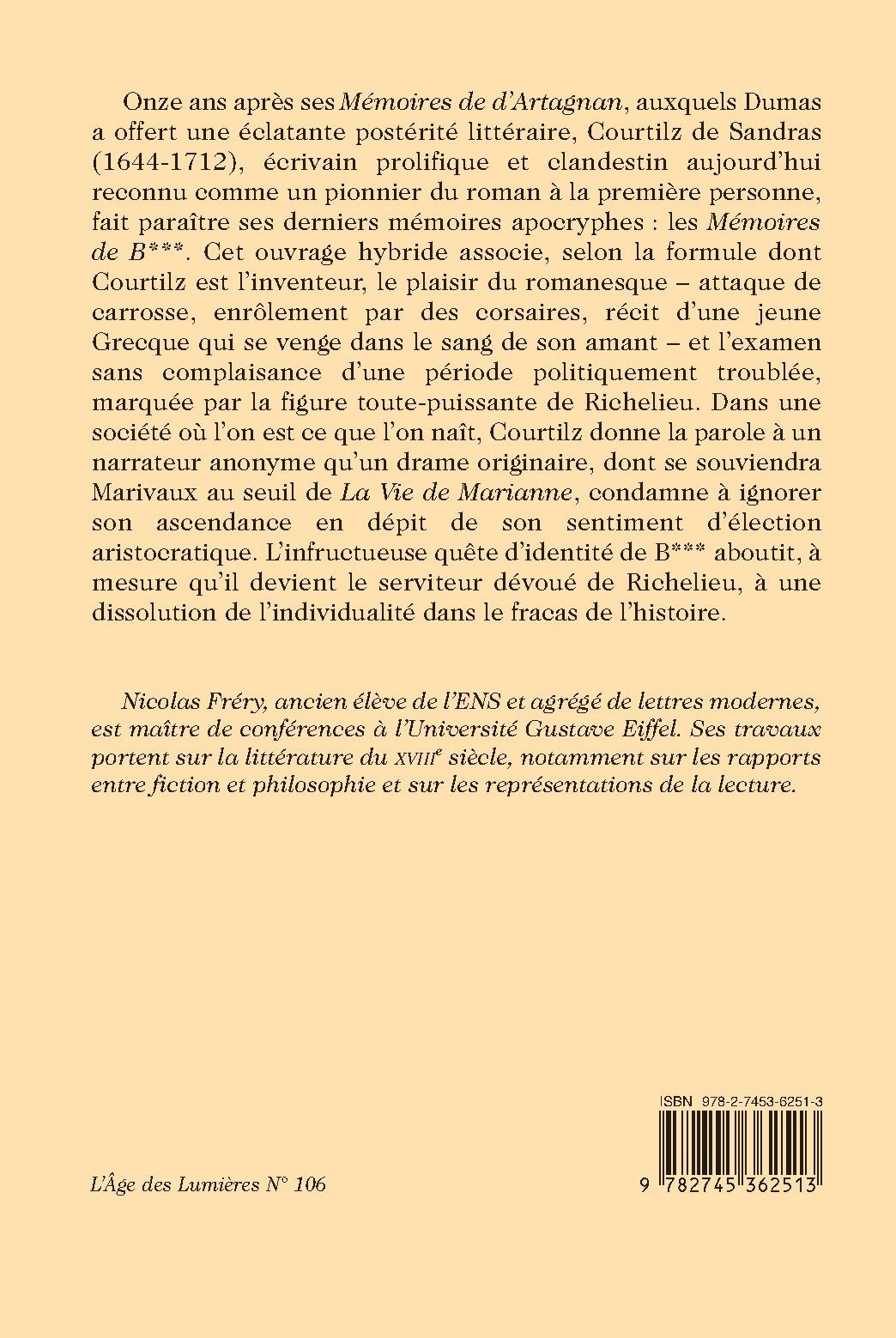 Onze ans après ses Mémoires de d’Artagnan, auxquels Dumas a offert une éclatante postérité littéraire, Courtilz de Sandras (1644-1712), écrivain prolifique et clandestin aujourd’hui reconnu comme un pionnier du roman à la première personne, fait paraître ses derniers mémoires apocryphes : les Mémoires de B***. Cet ouvrage hybride associe, selon la formule dont Courtilz est l’inventeur, le plaisir du romanesque – attaque de carrosse, enrôlement par des corsaires, récit d’une jeune Grecque qui se venge dans le sang de son amant – et l’examen sans complaisance d’une période politiquement troublée, marquée par la figure toute-puissante de Richelieu. Dans une société où l’on est ce que l’on naît, Courtilz donne la parole à un narrateur anonyme qu’un drame originaire, dont se souviendra Marivaux au seuil de La Vie de Marianne, condamne à ignorer son ascendance en dépit de son sentiment d’élection aristocratique. L’infructueuse quête d’identité de B*** aboutit, à mesure qu’il devient le serviteur dévoué de Richelieu, à une dissolution de l’individualité dans le fracas de l’histoire.