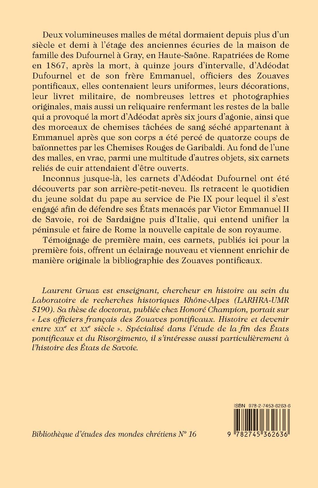 Deux volumineuses malles de métal dormaient depuis plus d’un siècle et demi à l’étage des anciennes écuries de la maison de famille des Dufournel à Gray, en Haute-Saône. Rapatriées de Rome en 1867, après la mort, à quinze jours d’intervalle, d’Adéodat Dufournel et de son frère Emmanuel, officiers des Zouaves pontificaux, elles contenaient leurs uniformes, leurs décorations, leur livret militaire, de nombreuses lettres et photographies originales, mais aussi un reliquaire renfermant les restes de la balle qui a provoqué la mort d’Adéodat après six jours d’agonie, ainsi que des morceaux de chemises tâchées de sang séché appartenant à Emmanuel après que son corps a été percé de quatorze coups de baïonnettes par les Chemises Rouges de Garibaldi. Au fond de l’une des malles, en vrac, parmi une multitude d’autres objets, six carnets reliés de cuir attendaient d’être ouverts.