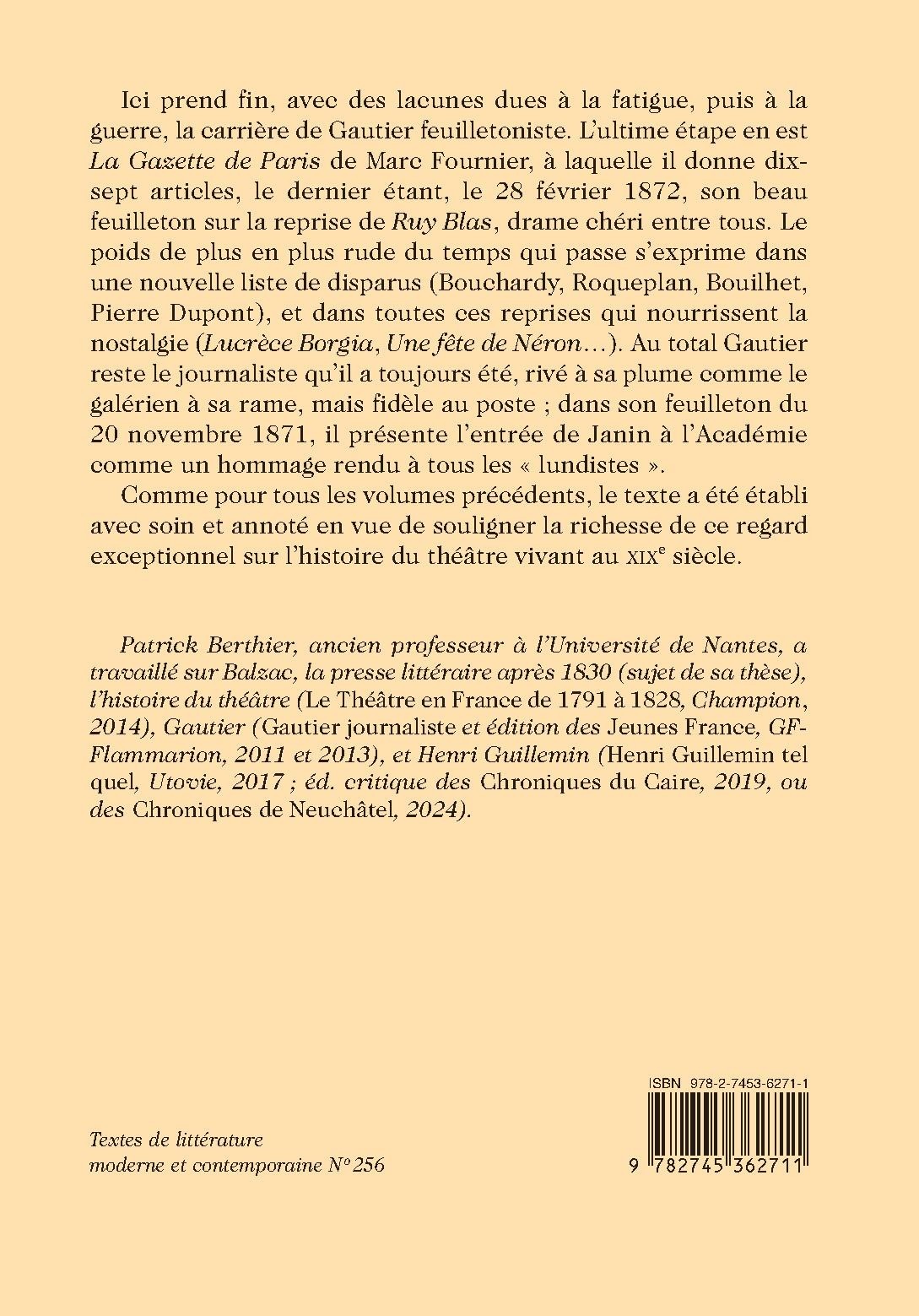 Ici prend fin, avec des lacunes dues à la fatigue, puis à la guerre, la carrière de Gautier feuilletoniste. L’ultime étape en est La Gazette de Paris de Marc Fournier, à laquelle il donne dixsept articles, le dernier étant, le 28 février 1872, son beau feuilleton sur la reprise de Ruy Blas, drame chéri entre tous. Le poids de plus en plus rude du temps qui passe s’exprime dans une nouvelle liste de disparus (Bouchardy, Roqueplan, Bouilhet, Pierre Dupont), et dans toutes ces reprises qui nourrissent la nostalgie (Lucrèce Borgia, Une fête de Néron…). Au total Gautier reste le journaliste qu’il a toujours été, rivé à sa plume comme le galérien à sa rame, mais fidèle au poste ; dans son feuilleton du 20 novembre 1871, il présente l’entrée de Janin à l’Académie comme un hommage rendu à tous les « lundistes ».
