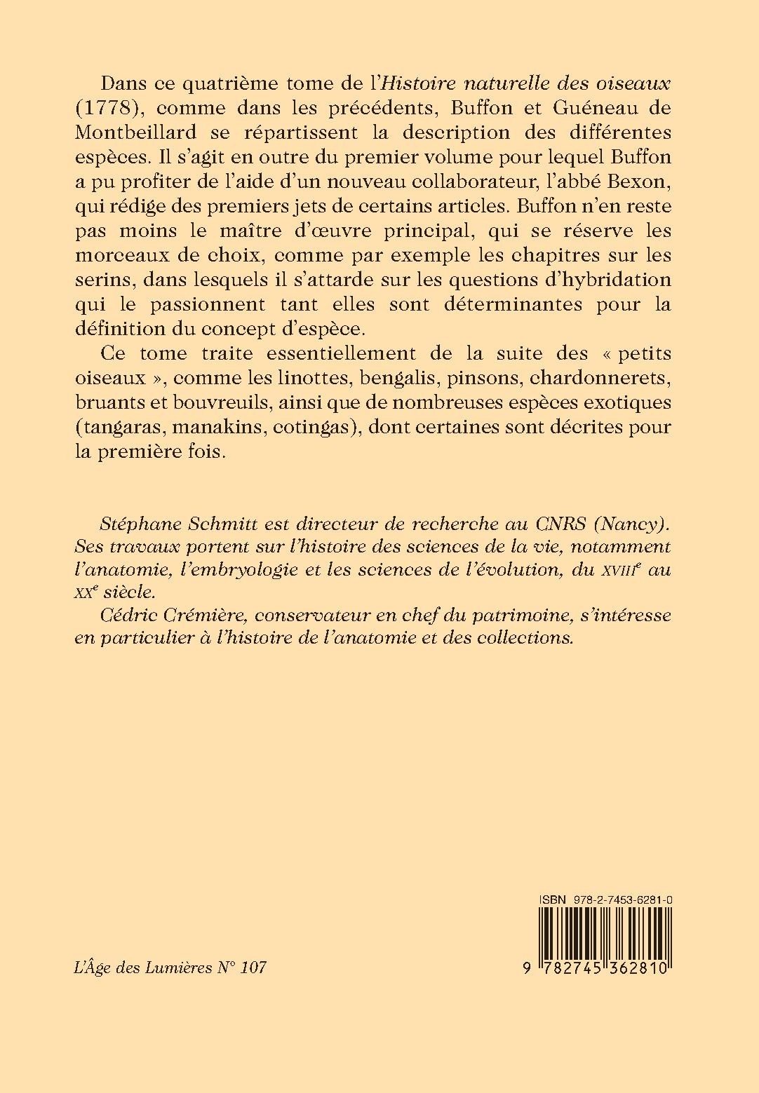 Dans ce quatrième tome de l’Histoire naturelle des oiseaux (1778), comme dans les précédents, Buffon et Guéneau de Montbeillard se répartissent la description des différentes espèces. Il s’agit en outre du premier volume pour lequel Buffon a pu profiter de l’aide d’un nouveau collaborateur, l’abbé Bexon, qui rédige des premiers jets de certains articles. Buffon n’en reste pas moins le maître d’œuvre principal, qui se réserve les morceaux de choix, comme par exemple les chapitres sur les serins, dans lesquels il s’attarde sur les questions d’hybridation qui le passionnent tant elles sont déterminantes pour la définition du concept d’espèce.