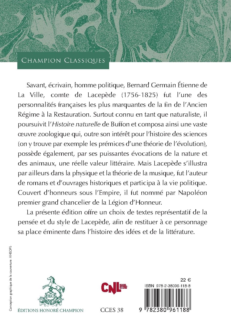 La présente édition offre un choix de textes représentatif de la pensée et du style de Lacepède, afin de restituer à ce personnage sa place éminente dans l’histoire des idées et de la littérature.