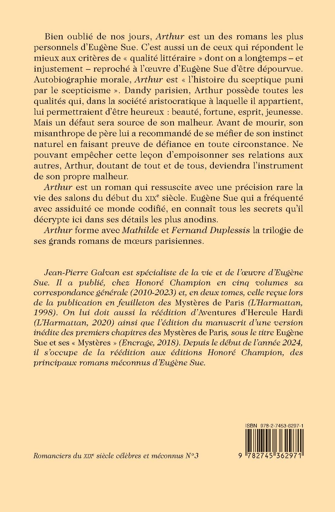 Bien oublié de nos jours, Arthur est un des romans les plus personnels d’Eugène Sue. C’est aussi un de ceux qui répondent le mieux aux critères de « qualité littéraire » dont on a longtemps – et injustement – reproché à l’œuvre d’Eugène Sue d’être dépourvue. Autobiographie morale, Arthur est « l’histoire du sceptique puni par le scepticisme ». Dandy parisien, Arthur possède toutes les qualités qui, dans la société aristocratique à laquelle il appartient, lui permettraient d’être heureux : beauté, fortune, esprit, jeunesse. Mais un défaut sera source de son malheur. Avant de mourir, son misanthrope de père lui a recommandé de se méfier de son instinct naturel en faisant preuve de défiance en toute circonstance. Ne pouvant empêcher cette leçon d’empoisonner ses relations aux autres, Arthur, doutant de tout et de tous, deviendra l’instrument de son propre malheur.