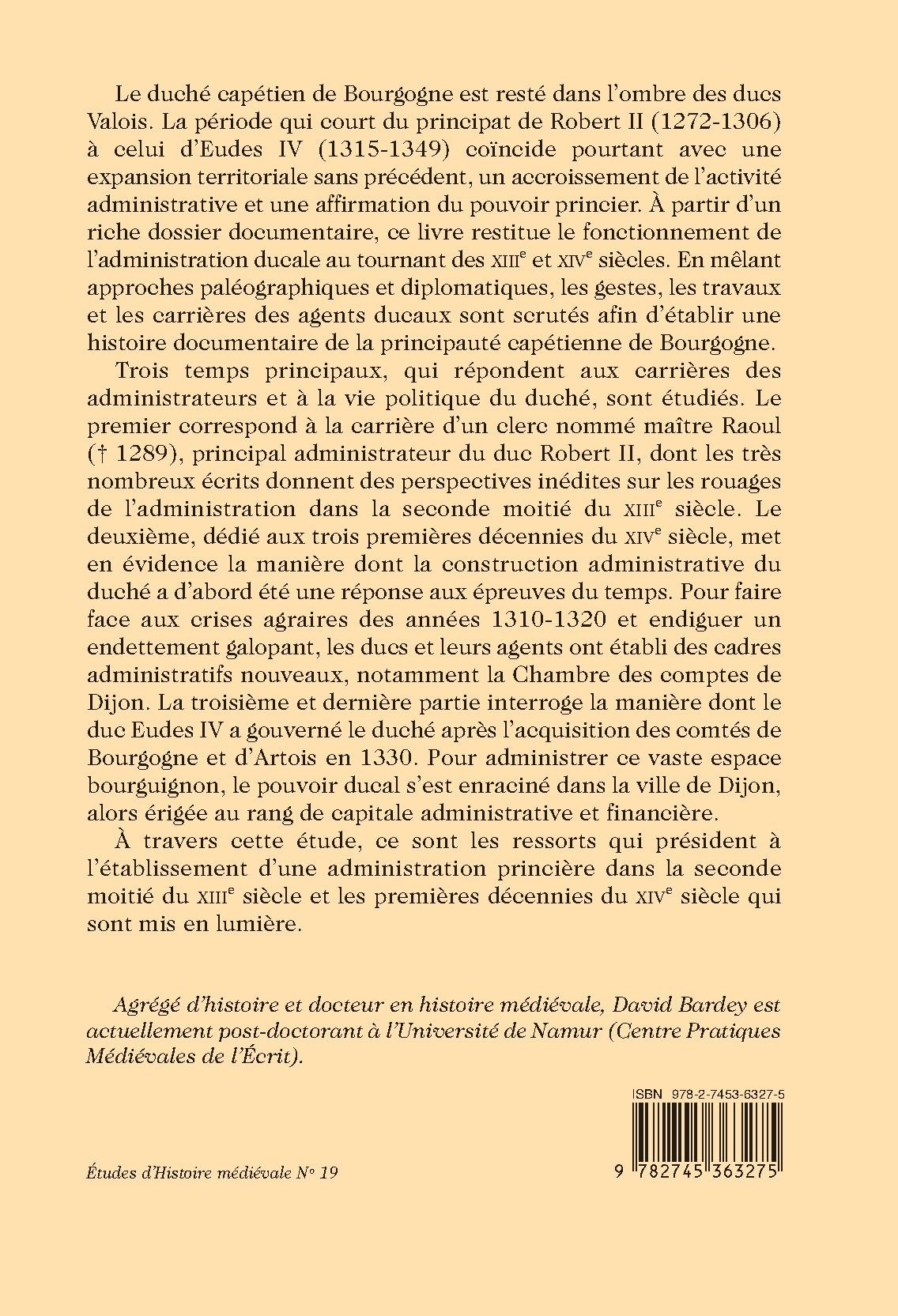 Trois temps principaux, qui répondent aux carrières des administrateurs et à la vie politique du duché, sont étudiés. Le premier correspond à la carrière d’un clerc nommé maître Raoul († 1289), principal administrateur du duc Robert II, dont les très nombreux écrits donnent des perspectives inédites sur les rouages de l’administration dans la seconde moitié du XIIIe siècle. Le deuxième, dédié aux trois premières décennies du XIVe siècle, met en évidence la manière dont la construction administrative du duché a d’abord été une réponse aux épreuves du temps. Pour faire face aux crises agraires des années 1310-1320 et endiguer un endettement galopant, les ducs et leurs agents ont établi des cadres administratifs nouveaux, notamment la Chambre des comptes de Dijon. La troisième et dernière partie interroge la manière dont le duc Eudes IV a gouverné le duché après l’acquisition des comtés de Bourgogne et d’Artois en 1330. Pour administrer ce vaste espace bourguignon, le pouvoir ducal s’est enraciné dans la ville de Dijon, alors érigée au rang de capitale administrative et financière.