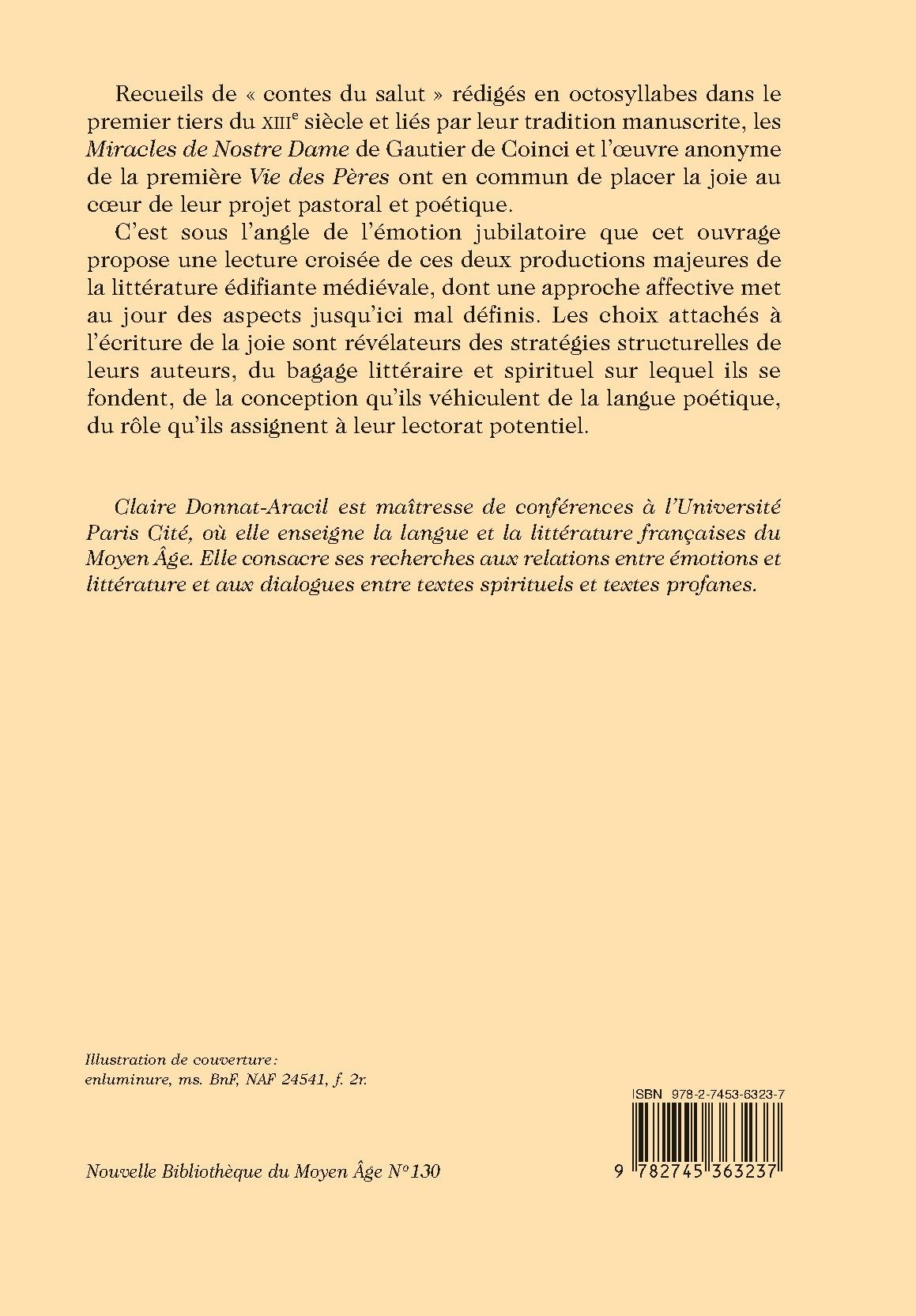 Recueils de « contes du salut » rédigés en octosyllabes dans le premier tiers du XIIIe siècle et liés par leur tradition manuscrite, les Miracles de Nostre Dame de Gautier de Coinci et l’œuvre anonyme de la première Vie des Pères ont en commun de placer la joie au cœur de leur projet pastoral et poétique.