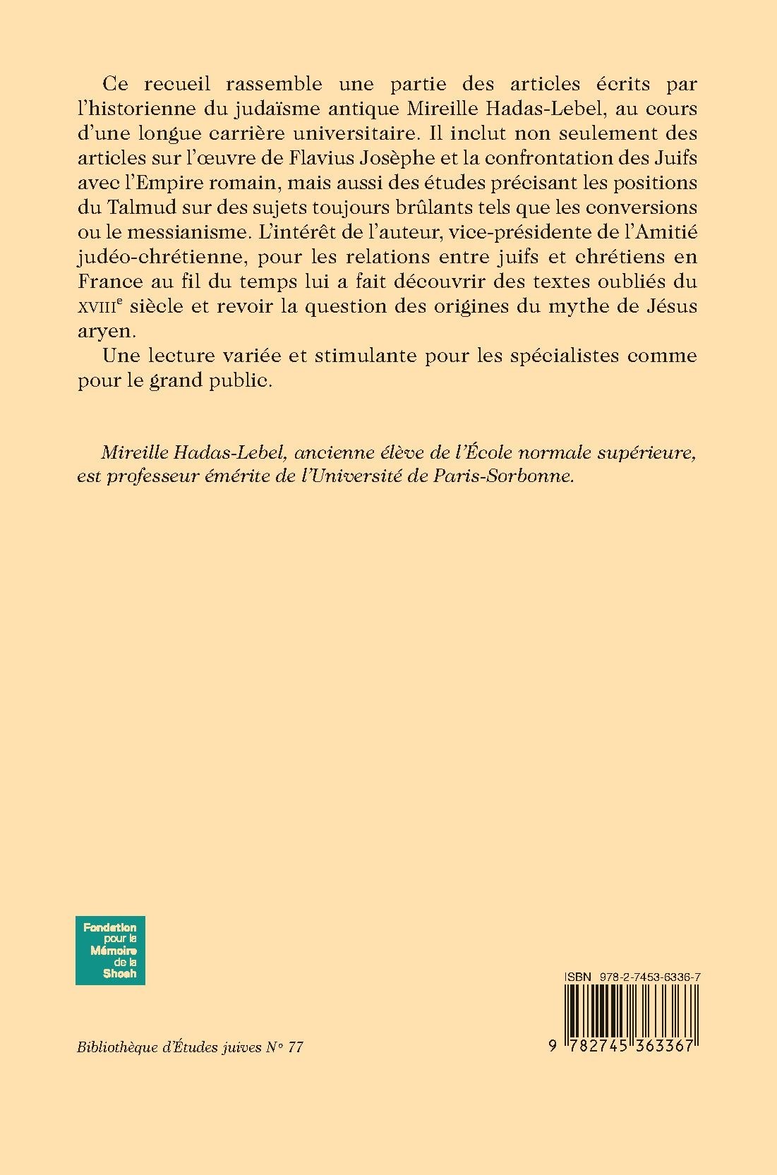 Ce recueil rassemble une partie des articles écrits par l’historienne du judaïsme antique Mireille Hadas-Lebel, au cours d’une longue carrière universitaire. Il inclut non seulement des articles sur l’œuvre de Flavius Josèphe et la confrontation des Juifs avec l’Empire romain, mais aussi des études précisant les positions du Talmud sur des sujets toujours brûlants tels que les conversions ou le messianisme. L’intérêt de l’auteur, vice-présidente de l’Amitié judéo-chrétienne, pour les relations entre juifs et chrétiens en France au fil du temps lui a fait découvrir des textes oubliés du XVIIIe siècle et revoir la question des origines du mythe de Jésus aryen.