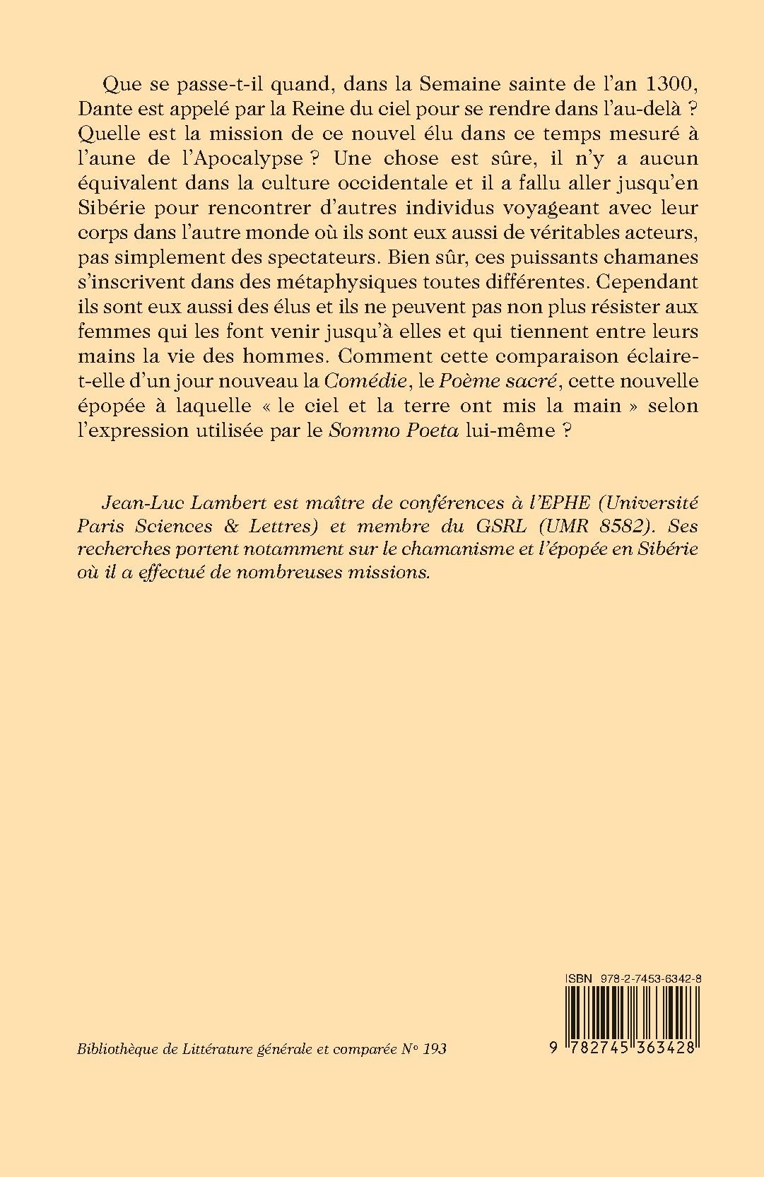 Que se passe-t-il quand, dans la Semaine sainte de l’an 1300, Dante est appelé par la Reine du ciel pour se rendre dans l’au-delà ? Quelle est la mission de ce nouvel élu dans ce temps mesuré à l’aune de l’Apocalypse ? Une chose est sûre, il n’y a aucun équivalent dans la culture occidentale et il a fallu aller jusqu’en Sibérie pour rencontrer d’autres individus voyageant avec leur corps dans l’autre monde où ils sont eux aussi de véritables acteurs, pas simplement des spectateurs. Bien sûr, ces puissants chamanes s’inscrivent dans des métaphysiques toutes différentes. Cependant ils sont eux aussi des élus et ils ne peuvent pas non plus résister aux femmes qui les font venir jusqu’à elles et qui tiennent entre leurs mains la vie des hommes. Comment cette comparaison éclaire-t- elle d’un jour nouveau la Comédie, le Poème sacré, cette nouvelle épopée à laquelle « le ciel et la terre ont mis la main » selon l’expression utilisée par le Sommo Pœta lui-même ?