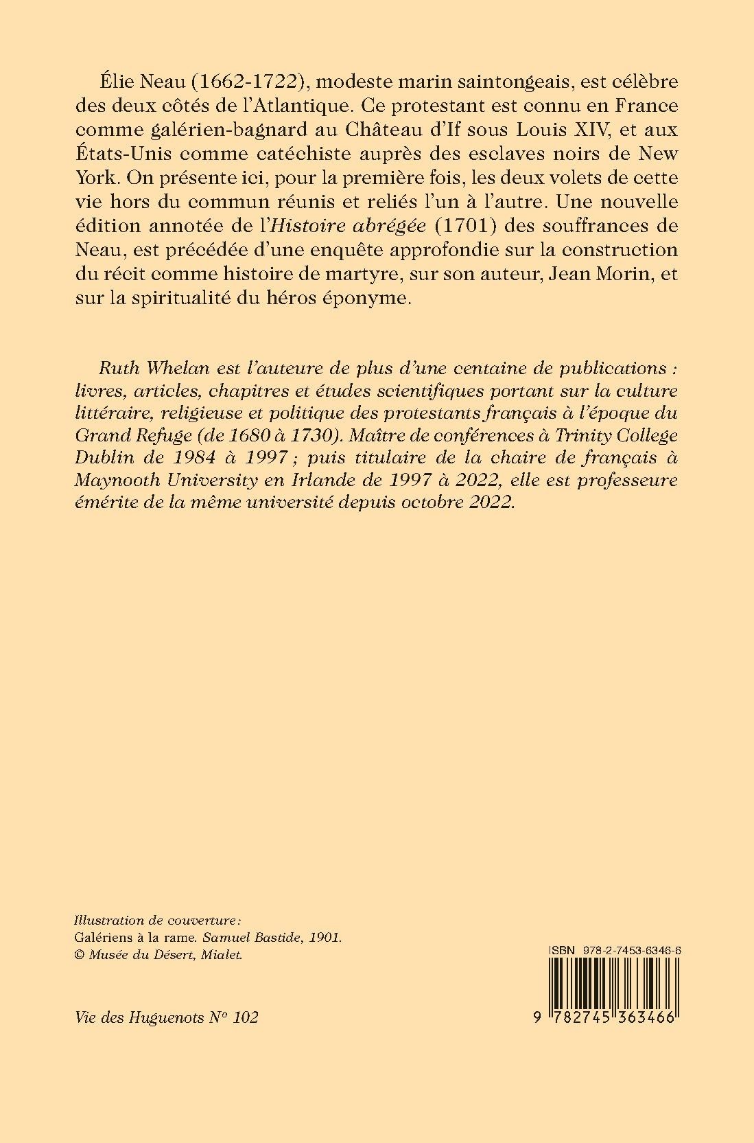 Élie Neau (1662-1722), modeste marin saintongeais, est célèbre des deux côtés de l’Atlantique. Ce protestant est connu en France comme galérien-bagnard au Château d’If sous Louis XIV, et aux États-Unis comme catéchiste auprès des esclaves noirs de New York. On présente ici, pour la première fois, les deux volets de cette vie hors du commun réunis et reliés l’un à l’autre. Une nouvelle édition annotée de l’Histoire abrégée (1701) des souffrances de Neau, est précédée d’une enquête approfondie sur la construction du récit comme histoire de martyre, sur son auteur, Jean Morin, et sur la spiritualité du héros éponyme.