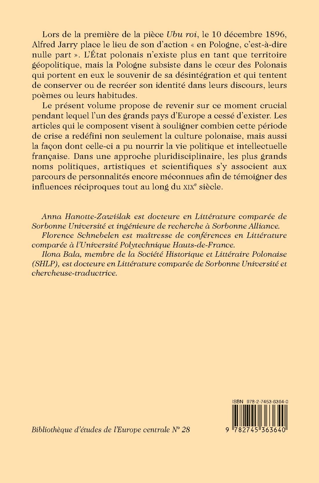 Lors de la première de la pièce Ubu roi, le 10 décembre 1896, Alfred Jarry place son lieu d’action « en Pologne, c’est-à-dire nulle part ». La Pologne indépendante n’existe plus en tant que territoire géopolitique, mais elle subsiste dans le coeur des Polonais qui portent en eux le souvenir de sa désintégration et qui tentent de conserver ou de recréer son identité dans leurs discours, leurs poèmes ou leurs habitudes. Le présent volume propose de revenir sur ce moment crucial pendant lequel l’un des grands pays d’Europe a cessé d’exister. Les articles qui le composent visent à souligner combien cette période de crise a redéfini non seulement la culture polonaise, mais aussi la façon dont celle-ci a pu nourrir la vie politique et intellectuelle française. Dans une approche pluridisciplinaire, les plus grands noms politiques, artistiques et scientifiques s’y associent aux parcours de personnalités encore méconnues afin de témoigner des influences réciproques tout au long du XIXe siècle.