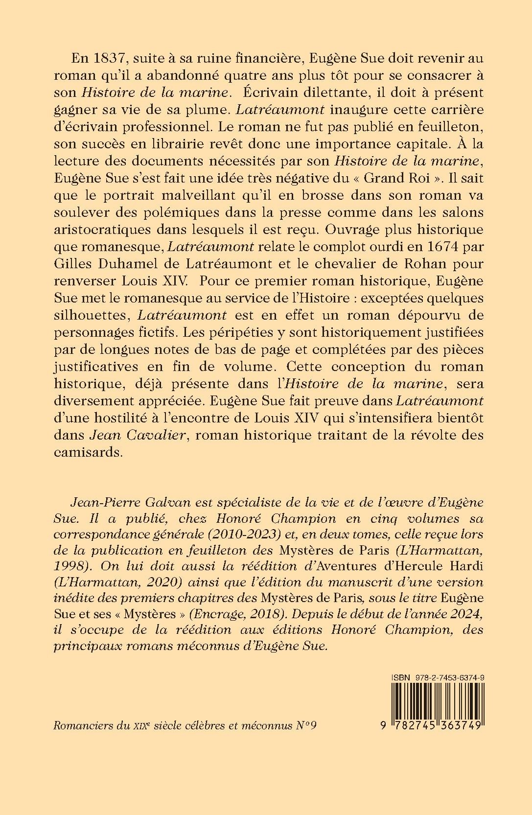 En 1837, suite à sa ruine financière, Eugène Sue doit revenir au roman qu’il a abandonné quatre ans plus tôt pour se consacrer à son Histoire de la marine. Écrivain dilettante, il doit à présent gagner sa vie de sa plume. Latréaumont inaugure cette carrière d’écrivain professionnel. Le roman ne fut pas publié en feuilleton, son succès en librairie revêt donc une importance capitale. À la lecture des documents nécessités par son Histoire de la marine, Eugène Sue s’est fait une idée très négative du « Grand Roi ». Il sait que le portrait malveillant qu’il en brosse dans son roman va soulever des polémiques dans la presse comme dans les salons aristocratiques dans lesquels il est reçu. Ouvrage plus historique que romanesque, Latréaumont relate le complot ourdi en 1674 par Gilles Duhamel de Latréaumont et le chevalier de Rohan pour renverser Louis XIV. Pour ce premier roman historique, Eugène Sue met le romanesque au service de l’Histoire : exceptées quelques silhouettes, Latréaumont est en effet un roman dépourvu de personnages fictifs. Les péripéties y sont historiquement justifiées par de longues notes de bas de page et complétées par des pièces justificatives en fin de volume. Cette conception du roman historique, déjà présente dans l’Histoire de la marine, sera diversement appréciée. Eugène Sue fait preuve dans Latréaumont d’une hostilité à l’encontre de Louis XIV qui s’intensifiera bientôt dans Jean Cavalier, roman historique traitant de la révolte des camisards.