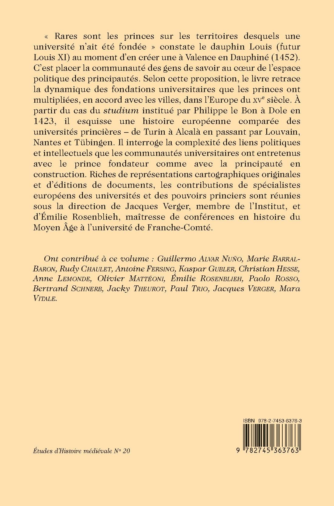 « Rares sont les princes sur les territoires desquels une université n’ait été fondée » constate le dauphin Louis (futur Louis XI) au moment d’en créer une à Valence en Dauphiné (1452). C’est placer la communauté des gens de savoir au coeur de l’espace politique des principautés. Selon cette proposition, le livre retrace la dynamique des fondations universitaires que les princes ont multipliées, en accord avec les villes, dans l’Europe du XVe siècle. À partir du cas du studium institué par Philippe le Bon à Dole en 1423, il esquisse une histoire européenne comparée des universités princières – de Turin à Alcalà en passant par Louvain, Nantes et Tübingen. Il interroge la complexité des liens politiques et intellectuels que les communautés universitaires ont entretenus avec le prince fondateur comme avec la principauté en construction. Riches de représentations cartographiques originales et d’éditions de documents, les contributions de spécialistes européens des universités et des pouvoirs princiers sont réunies sous la direction de Jacques Verger, membre de l’Institut, et d’Émilie Rosenblieh, maîtresse de conférences en histoire du Moyen Âge à l’université de Franche-Comté.
