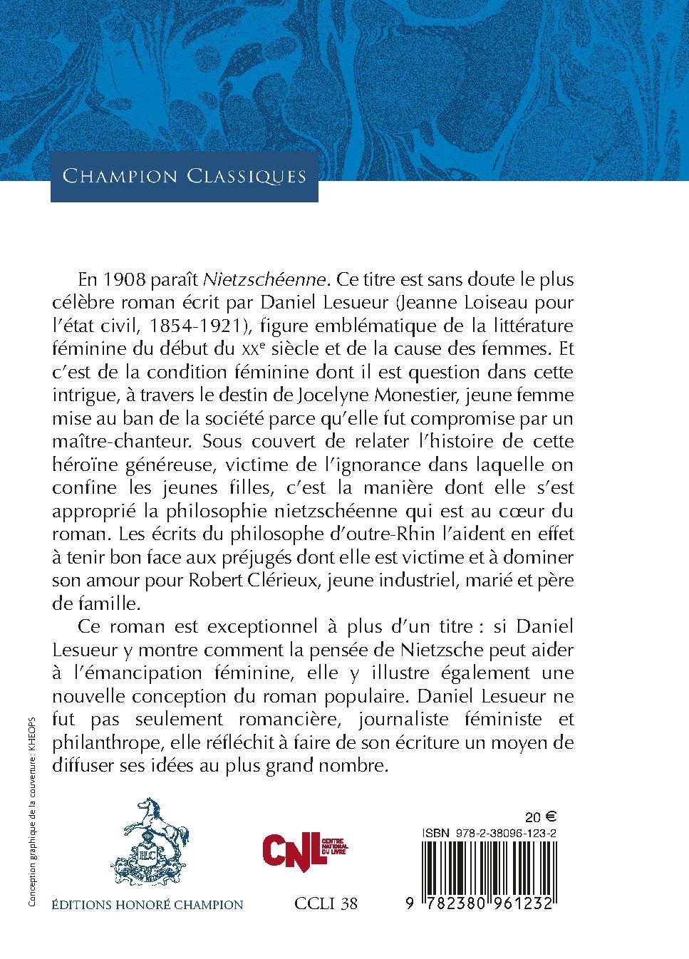 En 1908 paraît Nietzschéenne. Ce titre est sans doute le plus célèbre roman écrit par Daniel Lesueur (Jeanne Loiseau pour l’état civil, 1854-1921), figure emblématique de la littérature féminine du début du XXe siècle et de la cause des femmes. Et c’est de la condition féminine dont il est question dans cette intrigue, à travers le destin de Jocelyne Monestier, jeune femme mise au ban de la Société parce qu’elle fut compromise par un maître-chanteur. Sous couvert de relater l’histoire de cette héroïne généreuse, victime de l’ignorance dans laquelle on confine les jeunes filles, c’est la manière dont elle s’est approprié la philosophie nietzschéenne qui est au cœur du roman. Les écrits du philosophe d’outre-Rhin l’aident en effet à tenir bon face aux préjugés dont elle est victime et à dominer son amour pour Robert Clérieux, jeune industriel, marié et père de famille.
