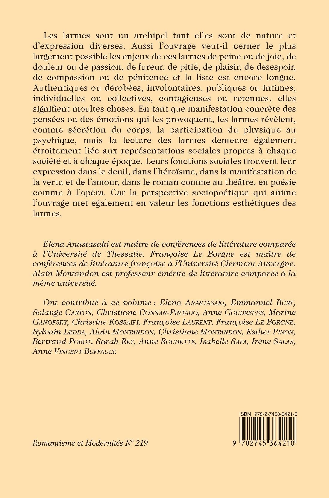 Les larmes sont un archipel tant elles sont de nature et d’expression diverses. Aussi l’ouvrage veut-il cerner le plus largement possible les enjeux de ces larmes de peine ou de joie, de douleur ou de passion, de fureur, de pitié, de plaisir, de désespoir, de compassion ou de pénitence et la liste est encore longue. Authentiques ou dérobées, involontaires, publiques ou intimes, individuelles ou collectives, contagieuses ou retenues, elles signifient moultes choses. En tant que manifestation concrète des pensées ou des émotions qui les provoquent, les larmes révèlent, comme sécrétion du corps, la participation du physique au psychique, mais la lecture des larmes demeure également étroitement liée aux représentations sociales propres à chaque société et à chaque époque. Leurs fonctions sociales trouvent leur expression dans le deuil, dans l’héroïsme, dans la manifestation de la vertu et de l’amour, dans le roman comme au théâtre, en poésie comme à l’opéra. Car la perspective sociopoétique qui anime l’ouvrage met également en valeur les fonctions esthétiques des larmes.