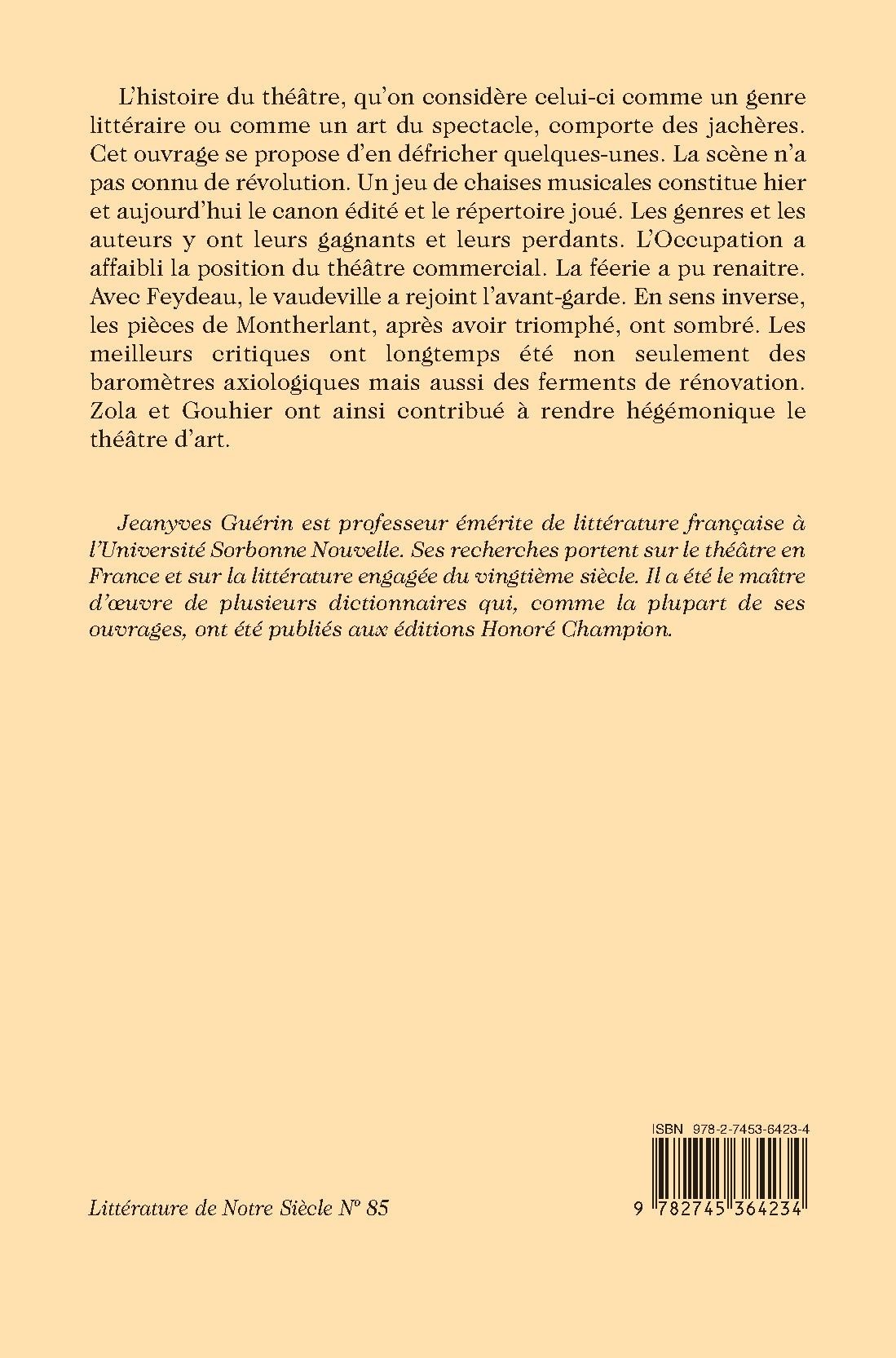 L’histoire du théâtre, qu’on considère celui-ci comme un genre littéraire ou comme un art du spectacle, comporte des jachères. Cet ouvrage se propose d’en défricher quelques-unes. La scène n’a pas connu de révolution. Un jeu de chaises musicales constitue hier et aujourd’hui le canon édité et le répertoire joué. Les genres et les auteurs y ont leurs gagnants et leurs perdants. L’Occupation a affaibli la position du théâtre commercial. La féerie a pu renaitre. Avec Feydeau, le vaudeville a rejoint l’avant-garde. En sens inverse, les pièces de Montherlant, après avoir triomphé, ont sombré. Les meilleurs critiques ont longtemps été non seulement des baromètres axiologiques mais aussi des ferments de rénovation. Zola et Gouhier ont ainsi contribué à rendre hégémonique le théâtre d’art.