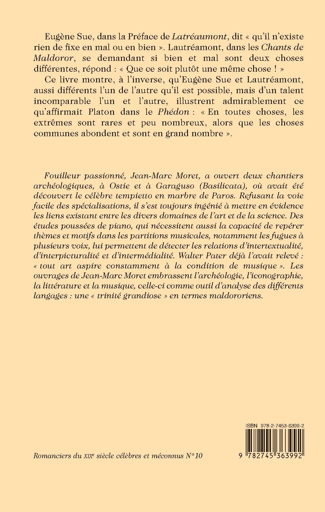 Eugène Sue, dans la Préface de Latréaumont, dit « qu’il n’existe rien de fixe en mal ou en bien ». Lautréamont, dans les Chants de Maldoror, se demandant si bien et mal sont deux choses différentes, répond : « Que ce soit plutôt une même chose ! » Ce livre montre, à l’inverse, qu’Eugène Sue et Lautréamont, aussi différents l’un de l’autre qu’il est possible, mais d’un talent incomparable l’un et l’autre, illustrent admirablement ce qu’affirmait Platon dans le Phédon : « En toutes choses, les extrêmes sont rares et peu nombreux, alors que les choses communes abondent et sont en grand nombre ».