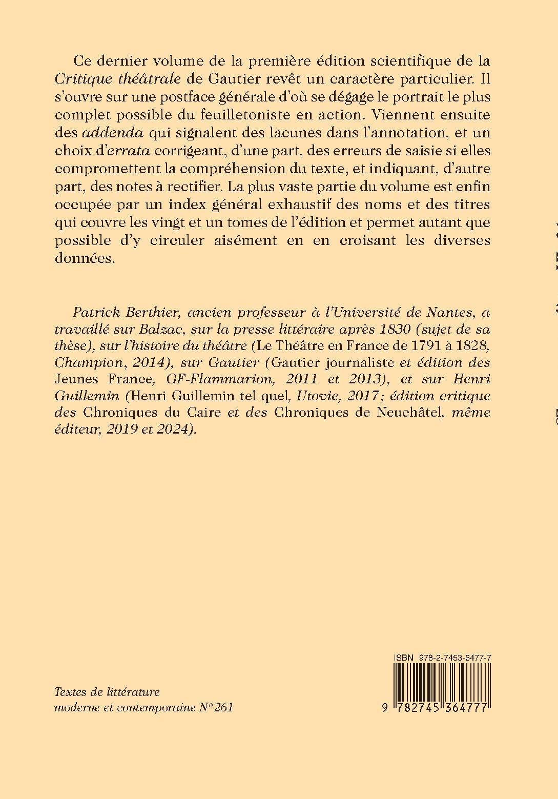Ce dernier volume de la première édition scientifique de la Critique théâtrale de Gautier revêt un caractère particulier. Il s’ouvre sur une postface générale d’où se dégage le portrait le plus complet possible du feuilletoniste en action. Viennent ensuite des addenda qui signalent des lacunes dans l’annotation, et un choix d’errata corrigeant, d’une part, des erreurs de saisie si elles compromettent la compréhension du texte, et indiquant, d’autre part, des notes à rectifier. La plus vaste partie du volume est enfin occupée par un index général exhaustif des noms et des titres qui couvre les vingt et un tomes de l’édition et permet autant que possible d’y circuler aisément en en croisant les diverses données.