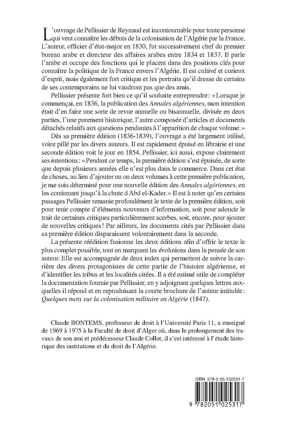 L’ouvrage de Pellissier de Reynaud est incontournable pour toute personne qui veut connaître les débuts de la colonisation de l’Algérie par la France. L’auteur, officier d’état-major en 1830, fut successivement chef du premier bureau arabe et directeur des affaires arabes entre 1834 et 1837. Il parle l’arabe et occupe des fonctions qui le placent dans des positions clés pour connaître la politique de la France envers l’Algérie. Il est cultivé et curieux d’esprit, mais également fort critique et les portraits qu’il dresse de certains de ses contemporains ne lui vaudront pas que des amis. Dès sa première édition (1836-1839), l’ouvrage a été largement utilisé, voire pillé par les divers auteurs. Il est rapidement épuisé en librairie et une seconde édition voit le jour en 1854. Il est à noter qu’en certains passages Pellissier remanie profondément le texte de la première édition, soit pour tenir compte d’éléments nouveaux d’information, soit pour adoucir le trait de certaines critiques particulièrement acerbes, soit, encore, pour ajouter de nouvelles critiques ! Par ailleurs, les documents cités par Pellissier dans sa première édition disparaissent volontairement dans la seconde. La présente réédition fusionne les deux éditions afin d’offrir le texte le plus complet possible, tout en marquant les évolutions dans la pensée de son auteur. Elle est accompagnée de deux index qui permettent de suivre la carrière des divers protagonistes de cette partie de l’histoire algérienne, et d’identifier les tribus et les localités citées. Il a été estimé utile de compléter la documentation fournie par Pellissier, en y adjoignant quelques lettres auxquelles il répond et en reproduisant la courte brochure de l’auteur intitulée : « Quelques mots sur la colonisation militaire en Algérie » (1847).