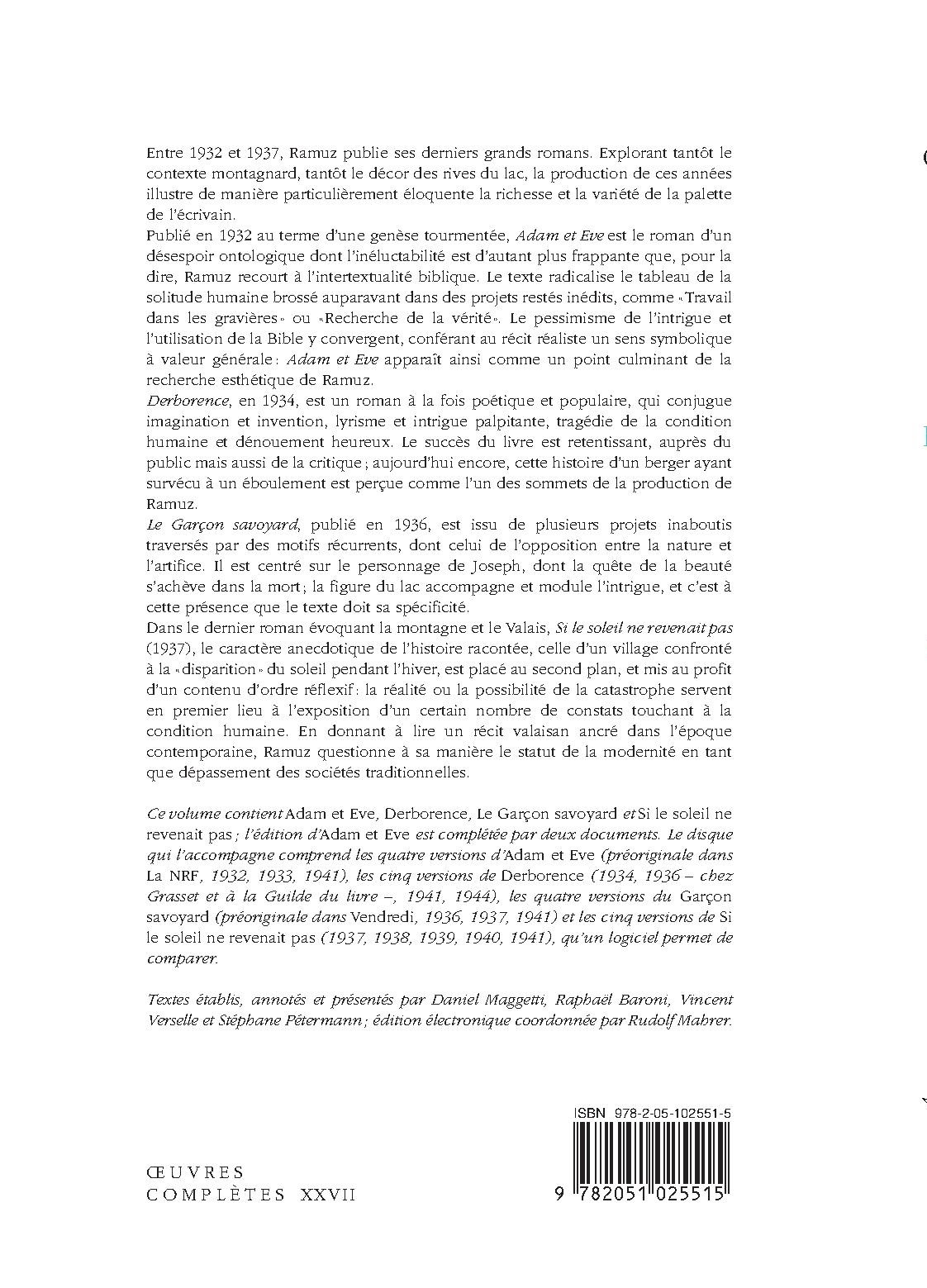 Ce volume contient « Adam et Eve », « Derborence », « Le Garçon savoyard » et « Si le soleil ne revenait pas » ; l’édition d’ « Adam et Eve » est accompagnée de deux documents. Le disque qui l’accompagne comprend les quatre versions d’ « Adam et Eve » (préoriginale dans La NRF, 1932, 1933, 1941), les cinq versions de « Derborence » (1934, 1936 – chez Grasset et à la Guilde du livre –, 1941, 1944), les quatre versions du « Garçon savoyard » (préoriginale dans Vendredi, 1936, 1937, 1941) et les cinq versions de « Si le soleil ne revenait pas » (1937, 1938, 1939, 1940, 1941), qu’un logiciel permet de comparer.