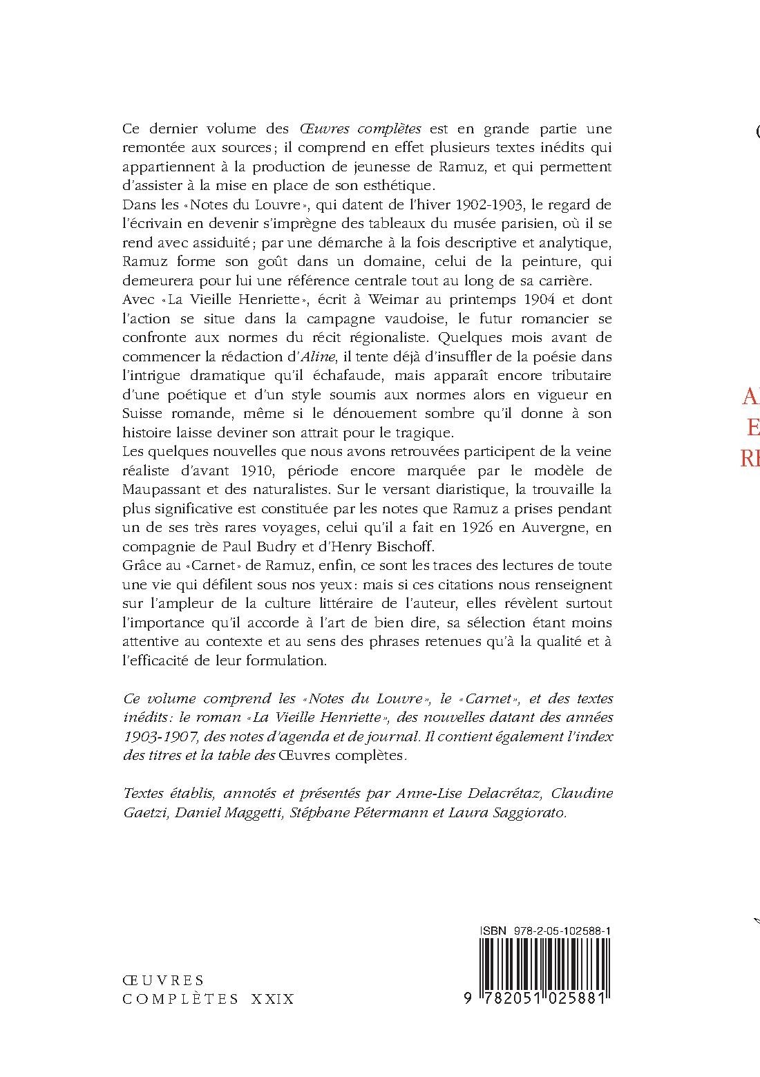 Ce dernier volume des « Œuvres complètes » est en grande partie une remontée aux sources ; il comprend en effet plusieurs textes inédits qui appartiennent à la production de jeunesse de Ramuz, et qui permettent d’assister à la mise en place de son esthétique. Dans les « Notes du Louvre », qui datent de l’hiver 1902-1903, le regard de l’écrivain en devenir s’imprègne des tableaux du musée parisien, où il se rend avec assiduité ; par une démarche à la fois descriptive et analytique, Ramuz forme son goût dans un domaine, celui de la peinture, qui demeurera pour lui une référence centrale tout au long de sa carrière. Avec « La Vieille Henriette », écrit à Weimar au printemps 1904 et dont l’action se situe dans la campagne vaudoise, le futur romancier se confronte aux normes du récit régionaliste. Quelques mois avant de commencer la rédaction d’Aline, il tente déjà d’insuffler de la poésie dans l’intrigue dramatique qu’il échafaude, mais apparaît encore tributaire d’une poétique et d’un style soumis aux normes alors en vigueur en Suisse romande, même si le dénouement sombre qu’il donne à son histoire laisse deviner son attrait pour le tragique. Les quelques nouvelles que nous avons retrouvées participent de la veine réaliste d’avant 1910, période encore marquée par le modèle de Maupassant et des naturalistes. Grâce au « Carnet » de Ramuz, enfin, ce sont les traces des lectures de toute une vie qui défilent sous nos yeux : mais si ces citations nous renseignent sur l’ampleur de la culture littéraire de l’auteur, elles révèlent surtout l’importance qu’il accorde à l’art de bien dire, sa sélection étant moins attentive au contexte et au sens des phrases retenues qu’à la qualité et à l’efficacité de leur formulation. Ce volume contient également l’index des titres et la table des « Œuvres complètes ».