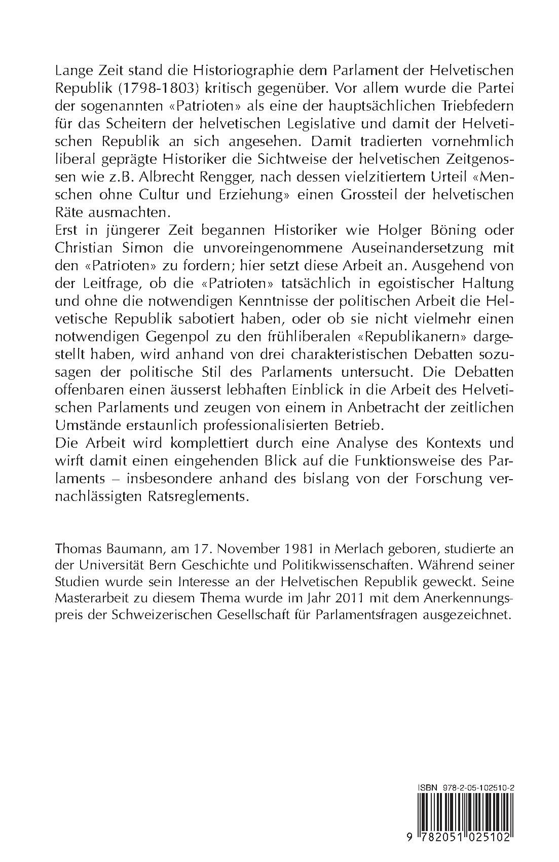 Lange Zeit stand die Historiographie dem Parlament der Helvetischen Republik (1798-1803) kritisch gegenüber. Vor allem wurde die Partei der sogenannten «Patrioten» als eine der hauptsächlichen Triebfedern für das Scheitern der helvetischen Legislative und damit der Helvetischen Republik an sich angesehen. Damit tradierten vornehmlich liberal geprägte Historiker die Sichtweise der helvetischen Zeitgenossen wie z.B. Albrecht Rengger, nach dessen vielzitiertem Urteil «Menschen ohne Cultur und Erziehung» einen Grossteil der helvetischen Räte ausmachten. Erst in jüngerer Zeit begannen Historiker wie Holger Böning oder Christian Simon die unvoreingenommene Auseinandersetzung mit den «Patrioten» zu fordern; hier setzt diese Arbeit an. Ausgehend von der Leitfrage, ob die «Patrioten» tatsächlich in egoistischer Haltung und ohne die notwendigen Kenntnisse der politischen Arbeit die Helvetische Republik sabotiert haben, oder ob sie nicht vielmehr einen notwendigen Gegenpol zu den frühliberalen «Republikanern» dargestellt haben, wird anhand von drei charakteristischen Debatten sozusagen der politische Stil des Parlaments untersucht. Die Debatten offenbaren einen äusserst lebhaften Einblick in die Arbeit des Helvetischen Parlaments und zeugen von einem in Anbetracht der zeitlichen Umstände erstaunlich professionalisierten Betrieb. Die Arbeit wird komplettiert durch eine Analyse des Kontexts und wirft damit einen eingehenden Blick auf die Funktionsweise des Parlaments – insbesondere anhand des bislang von der Forschung vernachlässigten Ratsreglements.