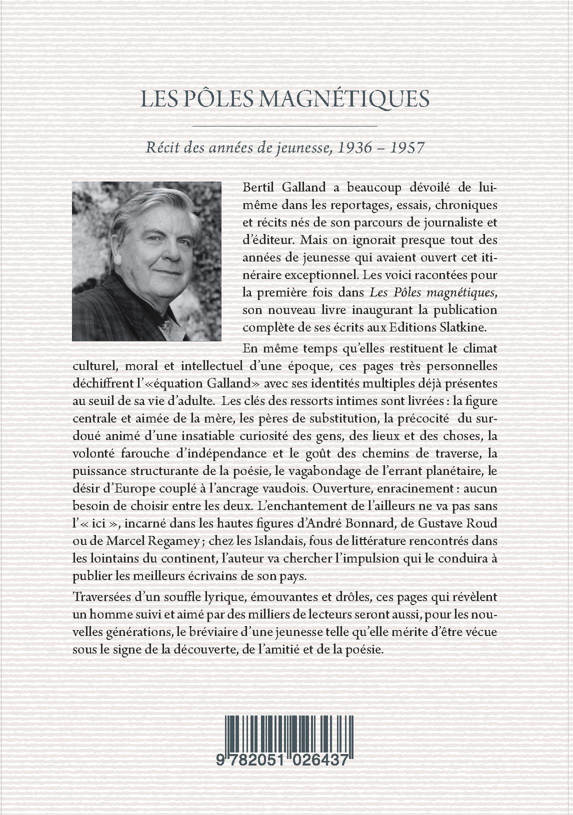Bertil Galland a beaucoup révélé de lui-même dans les reportages, les essais, les chroniques et les livres nés de son parcours de journaliste et d’éditeur. Mais on ignorait presque tout des années de jeunesse qui avaient ouvert ce parcours exceptionnel. Les voici racontées pour la première fois dans Les Pôles magnétiques, son nouveau livre inaugurant la publication complète de ses écrits aux Editions Slatkine.