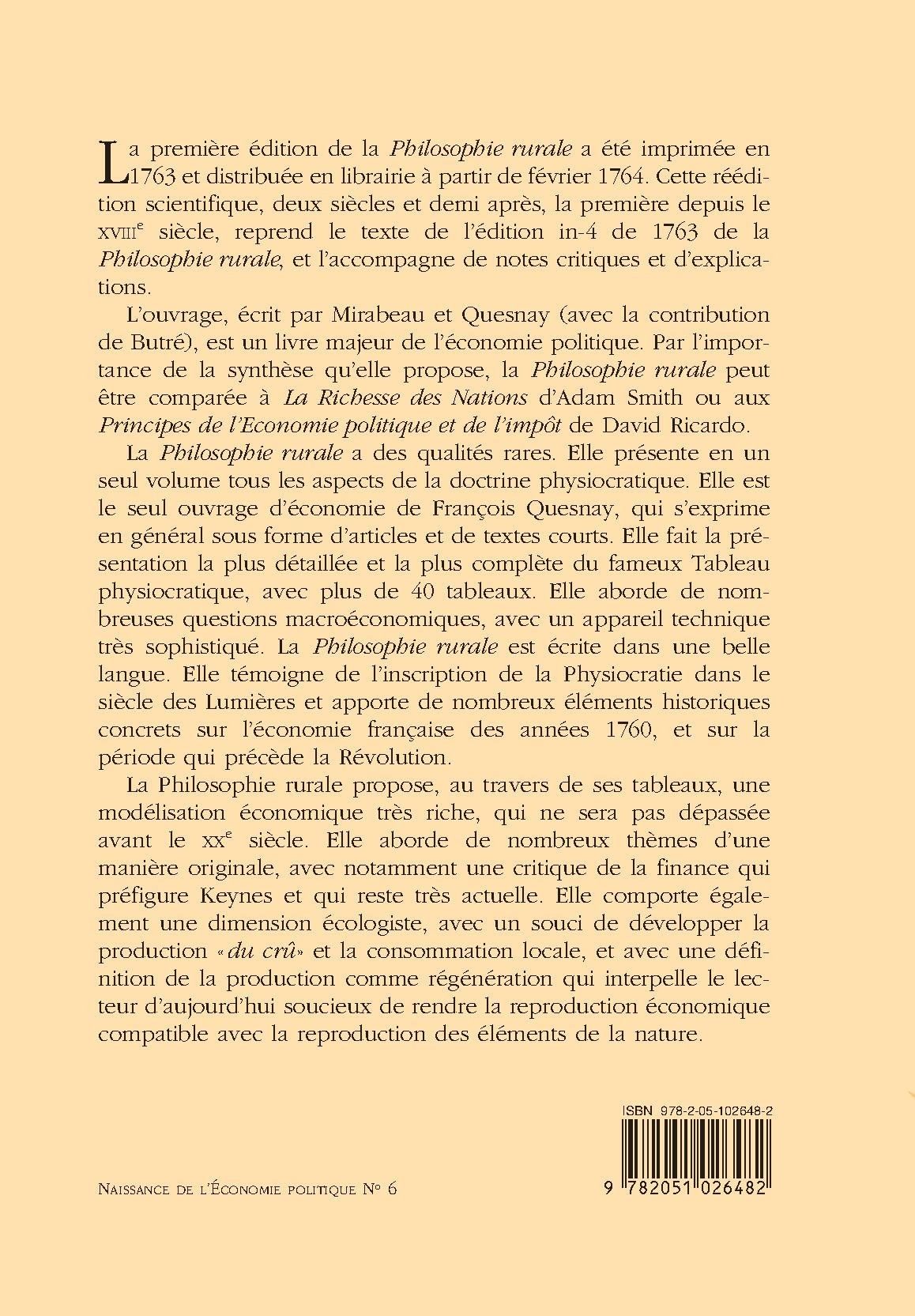 La Philosophie rurale a des qualités rares. Elle présente en un seul volume tous les aspects de la doctrine physiocratique. Elle est le seul ouvrage d’économie de François Quesnay, qui s’exprime en général sous forme d’articles et de textes courts. Elle fait la présentation la plus détaillée et la plus complète du fameux Tableau physiocratique, avec plus de 40 tableaux. Elle aborde de nombreuses questions macroéconomiques, avec un appareil technique très sophistiqué. La Philosophie rurale est écrite dans une belle langue. Elle témoigne de l’inscription de la Physiocratie dans le siècle des Lumières et apporte de nombreux éléments historiques concrets sur l’économie française des années 1760, et sur la période qui précède la Révolution.