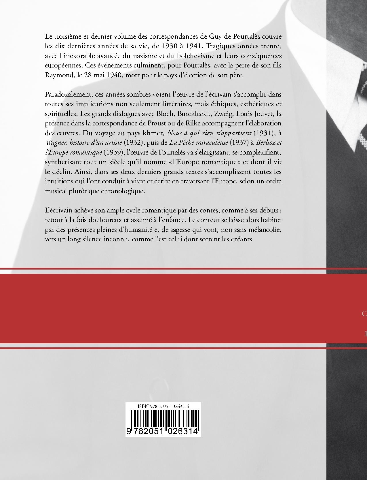 Le troisième et dernier volume des correspondances de Guy de Pourtalès couvre les dix dernières années de sa vie, de 1930 à 1941. Tragiques années trente, avec l’inexorable avancée du nazisme et du bolchevisme et leurs conséquences européennes. Ces événements culminent, pour Pourtalès, avec la perte de son fils Raymond, le 28 mai 1940, mort pour le pays d’élection de son père.