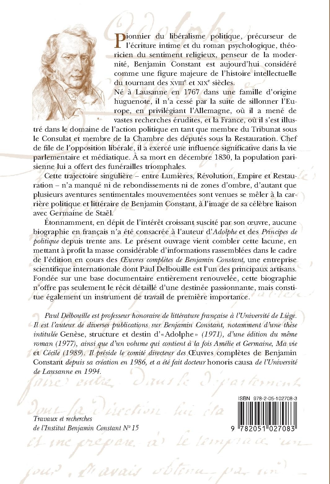Étonnamment, en dépit de l’intérêt croissant suscité par son œuvre, aucune biographie en français n’a été consacrée à l’auteur d’Adolphe et des Principes de politique depuis trente ans. Le présent ouvrage vient combler cette lacune, en mettant à profit la masse considérable d’informations rassemblées dans le cadre de l’édition en cours des Œuvres complètes de Benjamin Constant, une entreprise scientifique internationale dont Paul Delbouille est l’un des principaux artisans. Fondée sur une base documentaire entièrement renouvelée, cette biographie n’offre pas seulement le récit détaillé d’une destinée passionnante, mais constitue également un instrument de travail de première importance.