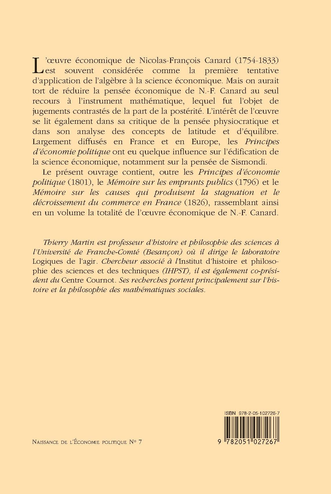 L’œuvre économique de Nicolas-François Canard (1754-1833) est souvent considérée comme la première tentative d’application de l’algèbre à la science économique. Mais on aurait tort de réduire la pensée économique de N.-F. Canard au seul recours à l’instrument mathématique, lequel fut l’objet de jugements contrastés de la part de la postérité. L’intérêt de l’œuvre se lit également dans sa critique de la pensée physiocratique et dans son analyse des concepts de latitude et d’équilibre. Largement diffusés en France et en Europe, les Principes d’économie politique ont eu quelque influence sur l’édification de la science économique, notamment sur la pensée de Sismondi. Le présent ouvrage contient, outre les Principes d’économie politique (1801), le Mémoire sur les emprunts publics (1796) et le Mémoire sur les causes qui produisent la stagnation et le décroissement du commerce en France (1826), rassemblant ainsi en un volume la totalité de l’œuvre économique de N.-F. Canard.