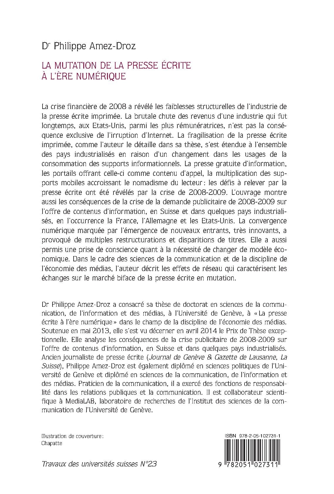 Dr Philippe Amez-Droz a consacré sa thèse de doctorat en sciences de la communication, de l’information et des médias, à l’Université de Genève, à « La presse écrite à l’ère numérique » dans le champ de la discipline de l’économie des médias. Soutenue en mai 2013, elle s’est vu décerner en avril 2014 le Prix de Thèse exceptionnelle. Elle analyse les conséquences de la crise publicitaire de 2008-2009 sur l’offre de contenus d’information, en Suisse et dans quelques pays industrialisés. Ancien journaliste de presse écrite (Journal de Genève & Gazette de Lausanne, La Suisse), Philippe Amez-Droz est également diplômé en sciences politiques de l’Université de Genève et diplômé en sciences de la communication, de l’information et des médias. Praticien de la communication, il a exercé des fonctions de responsabilité dans les relations publiques et la communication. Il est collaborateur scientifique à MediaLAB, laboratoire de recherches de l’Institut des sciences de la communication de l’Université de Genève.