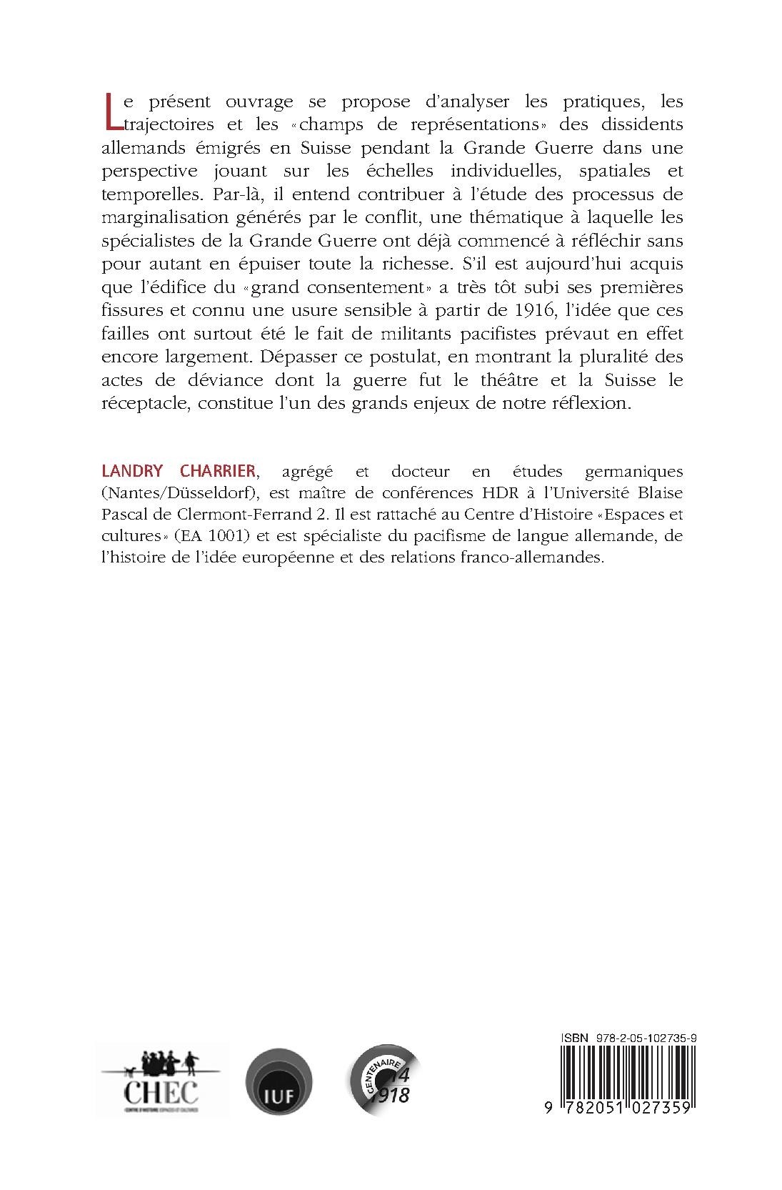 Le présent ouvrage se propose d’analyser les pratiques, les trajectoires et les « champs de représentations » des dissidents allemands émigrés en Suisse pendant la Grande Guerre dans une perspective jouant sur les échelles individuelles, spatiales et temporelles. Par-là, il entend contribuer à l’étude des processus de marginalisation générés par le conflit, une thématique à laquelle les spécialistes de la Grande Guerre ont déjà commencé à réfléchir sans pour autant en épuiser toute la richesse. S’il est aujourd’hui acquis que l’édifice du «grand consentement » a très tôt subi ses premières fissures et connu une usure sensible à partir de 1916, l’idée que ces failles ont surtout été le fait de militants pacifistes prévaut en effet encore largement. Dépasser ce postulat, en montrant la pluralité des actes de déviance dont la guerre fut le théâtre et la Suisse le réceptacle, constitue l’un des grands enjeux de notre réflexion.