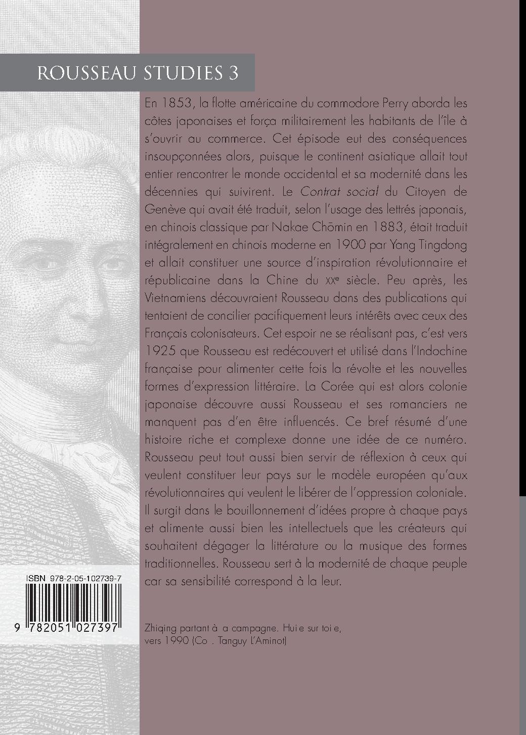 En 1853, la flotte américaine du commodore Perry aborda les côtes japonaises et força militairement les habitants de l’île à s’ouvrir au commerce. Cet épisode eut des conséquences insoupçonnées alors, puisque le continent asiatique allait tout entier rencontrer le monde occidental et sa modernité dans les décennies qui suivirent. Le Contrat social du Citoyen de Genève qui avait été traduit, selon l’usage des lettrés japonais, en chinois classique par Nakae Chomin en 1883, était traduit intégralement en chinois moderne en 1900 par Yang Tingdong et allait constituer une source d’inspiration révolutionnaire et républicaine dans la Chine du XXe siècle. Peu après, les Vietnamiens découvraient Rousseau dans des publications qui tentaient de concilier pacifiquement leurs intérêts avec ceux des Français colonisateurs. Cet espoir ne se réalisant pas, c’est vers 1925 que Rousseau est redécouvert et utilisé dans l’Indochine française pour alimenter cette fois la révolte et les nouvelles formes d’expression littéraire. La Corée qui est alors colonie japonaise découvre aussi Rousseau et ses romanciers ne manquent pas d’en être influencés. Ce bref résumé d’une histoire riche et complexe donne une idée de ce numéro. Rousseau peut tout aussi bien servir de réflexion à ceux qui veulent constituer leur pays sur le modèle européen qu’aux révolutionnaires qui veulent le libérer de l’oppression coloniale. Il surgit dans le bouillonnement d’idées propre à chaque pays et alimente aussi bien les intellectuels que les créateurs qui souhaitent dégager la littérature ou la musique des formes traditionnelles. Rousseau sert à la modernité de chaque peuple car sa sensibilité correspond à la leur.