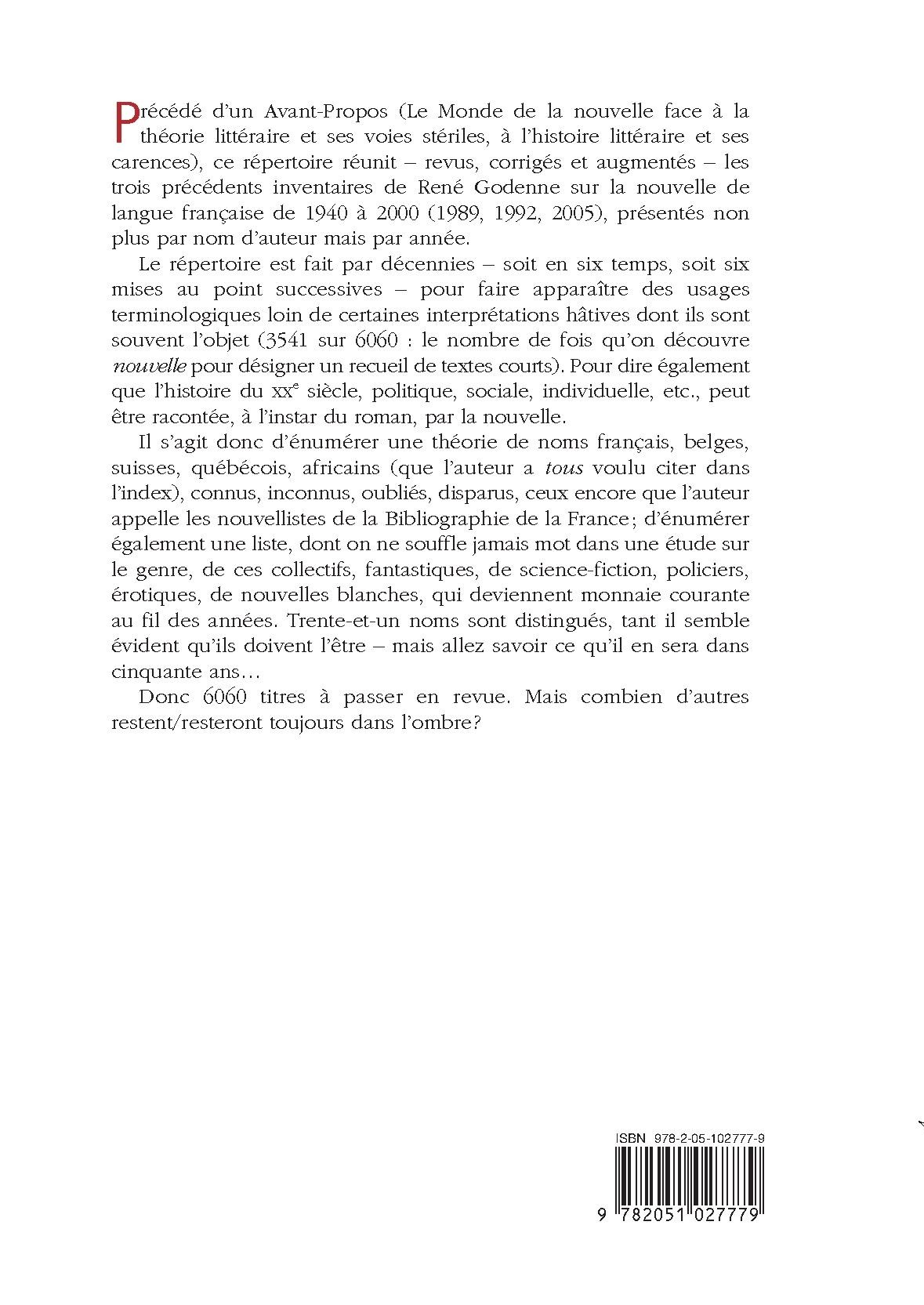 Précédé d’un Avant-Propos (Le Monde de la nouvelle face à la théorie littéraire et ses voies stériles, à l’histoire littéraire et ses carences), ce répertoire réunit – revus, corrigés et augmentés – les trois précédents inventaires de René Godenne sur la nouvelle de langue française de 1940 à 2000 (1989, 1992, 2005), présentés non plus par nom d’auteur mais par année.
