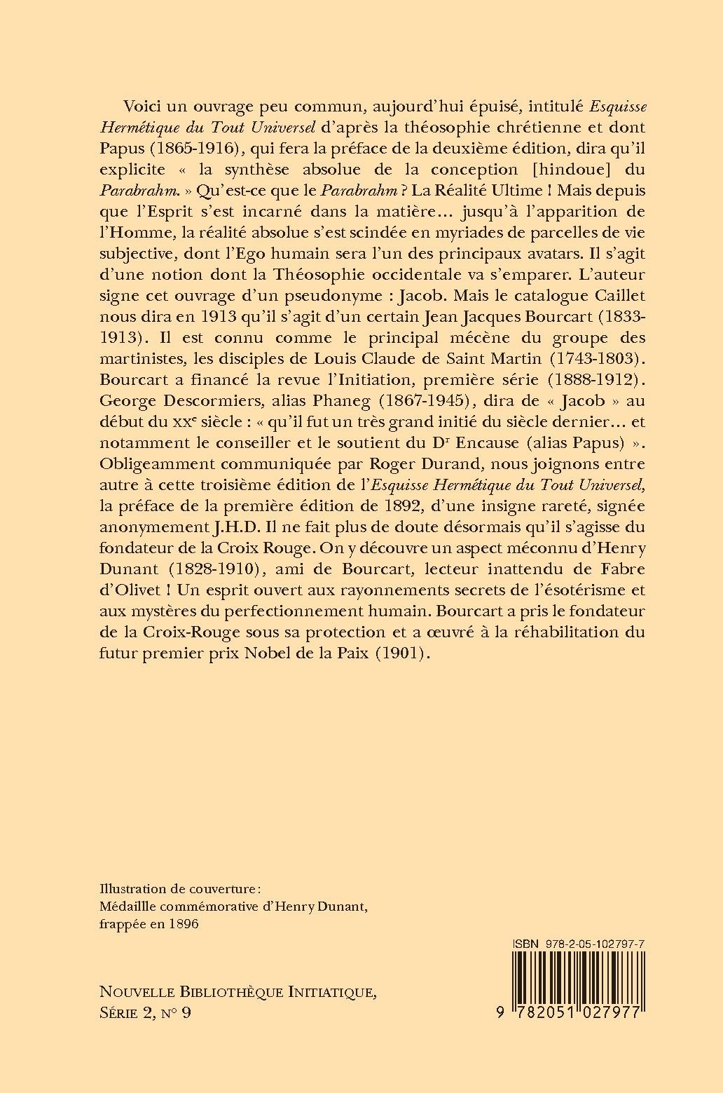 Voici un ouvrage peu commun, aujourd’hui épuisé, intitulé Esquisse Hermétique du Tout Universel d’après la théosophie chrétienne et dont Papus (1865-1916), qui fera la préface de la deuxième édition, dira qu’il explicite « la synthèse absolue de la conception [hindoue] du Parabrahm. » Qu’est-ce que le Parabrahm ? La Réalité Ultime ! Mais depuis que l’Esprit s’est incarné dans la matière… jusqu’à l’apparition de l’Homme, la réalité absolue s’est scindée en myriades de parcelles de vie subjective, dont l’Ego humain sera l’un des principaux avatars. Il s’agit d’une notion dont la Théosophie occidentale va s’emparer. L’auteur signe cet ouvrage d’un pseudonyme : Jacob. Mais le catalogue Caillet nous dira en 1913 qu’il s’agit d’un certain Jean Jacques Bourcart (1833- 1913). Il est connu comme le principal mécène du groupe des martinistes, les disciples de Louis Claude de Saint Martin (1743-1803). Bourcart a financé la revue l’Initiation, première série (1888-1912). George Descormiers, alias Phaneg (1867-1945), dira de « Jacob » au début du XXe siècle : « qu’il fut un très grand initié du siècle dernier… et notamment le conseiller et le soutient du Dr Encause (alias Papus) ». Obligeamment communiquée par Roger Durand, nous joignons entre autre à cette troisième édition de l’Esquisse Hermétique du Tout Universel, la préface de la première édition de 1892, d’une insigne rareté, signée anonymement J.H.D. Il ne fait plus de doute désormais qu’il s’agisse du fondateur de la Croix Rouge. On y découvre un aspect méconnu d’Henry Dunant (1828-1910), ami de Bourcart, lecteur inattendu de Fabre d’Olivet ! Un esprit ouvert aux rayonnements secrets de l’ésotérisme et aux mystères du perfectionnement humain. Bourcart a pris le fondateur de la Croix-Rouge sous sa protection et a œuvré à la réhabilitation du futur premier prix Nobel de la Paix (1901).
