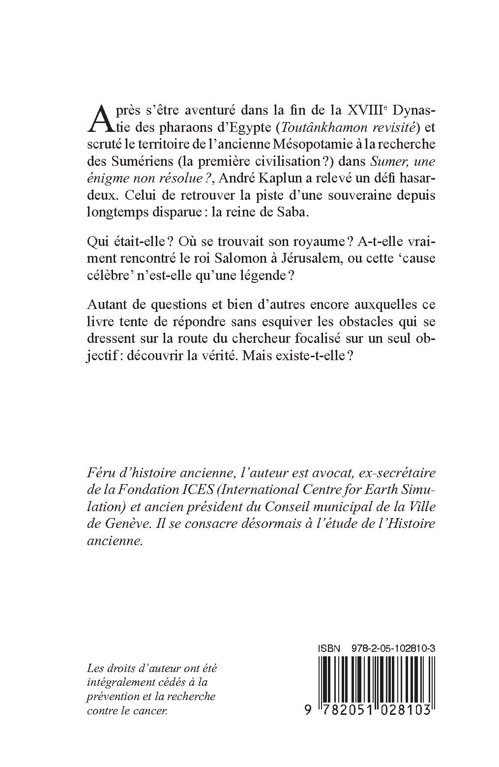 Après s’être aventuré dans la fin de la XVIIIe Dynastie des pharaons d’Egypte (Toutânkhamon revisité) et scruté le territoire de l’ancienne Mésopotamie à la recherche des Sumériens (la première civilisation ?) dans Sumer, une énigme non résolue ?, André Kaplun a relevé un défi hasardeux. Celui de retrouver la piste d’une souveraine depuis longtemps disparue : la reine de Saba.