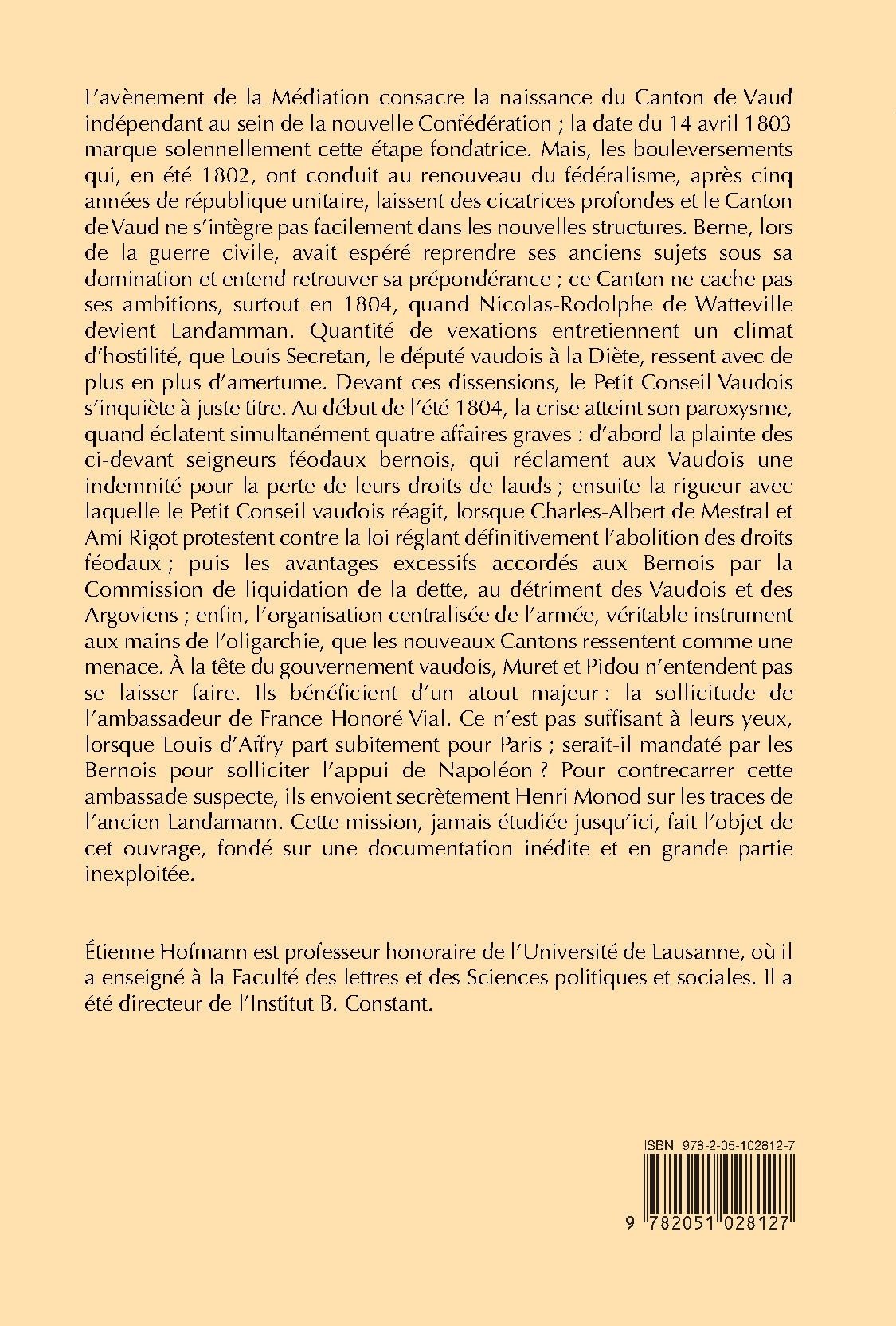 L’avènement de la Médiation consacre la naissance du Canton de Vaud indépendant au sein de la nouvelle Confédération ; la date du 14 avril 1803 marque solennellement cette étape fondatrice. Mais, les bouleversements qui, en été 1802, ont conduit au renouveau du fédéralisme, après cinq années de république unitaire, laissent des cicatrices profondes et le Canton de Vaud ne s’intègre pas facilement dans les nouvelles structures. Berne, lors de la guerre civile, avait espéré reprendre ses anciens sujets sous sa domination et entend retrouver sa prépondérance ; ce Canton ne cache pas ses ambitions, surtout en 1804, quand Nicolas-Rodolphe de Watteville devient Landamman. Quantité de vexations entretiennent un climat d’hostilité, que Louis Secretan, le député vaudois à la Diète, ressent avec de plus en plus d’amertume. Devant ces dissensions, le Petit Conseil Vaudois s’inquiète à juste titre. Au début de l’été 1804, la crise atteint son paroxysme, quand éclatent simultanément quatre affaires graves : d’abord la plainte des ci-devant seigneurs féodaux bernois, qui réclament aux Vaudois une indemnité pour la perte de leurs droits de lauds ; ensuite la rigueur avec laquelle le Petit Conseil vaudois réagit, lorsque Charles-Albert de Mestral et Ami Rigot protestent contre la loi réglant définitivement l’abolition des droits féodaux ; puis les avantages excessifs accordés aux Bernois par la Commission de liquidation de la dette, au détriment des Vaudois et des Argoviens ; enfin, l’organisation centralisée de l’armée, véritable instrument aux mains de l’oligarchie, que les nouveaux Cantons ressentent comme une menace. À la tête du gouvernement vaudois, Muret et Pidou n’entendent pas se laisser faire. Ils bénéficient d’un atout majeur : la sollicitude de l’ambassadeur de France Honoré Vial. Ce n’est pas suffisant à leurs yeux, lorsque Louis d’Affry part subitement pour Paris ; serait-il mandaté par les Bernois pour solliciter l’appui de Napoléon ? Pour contrecarrer cette ambassade suspecte, ils envoient secrètement Henri Monod sur les traces de l’ancien Landamann. Cette mission, jamais étudiée jusqu’ici, fait l’objet de cet ouvrage, fondé sur une documentation inédite et en grande partie inexploitée.