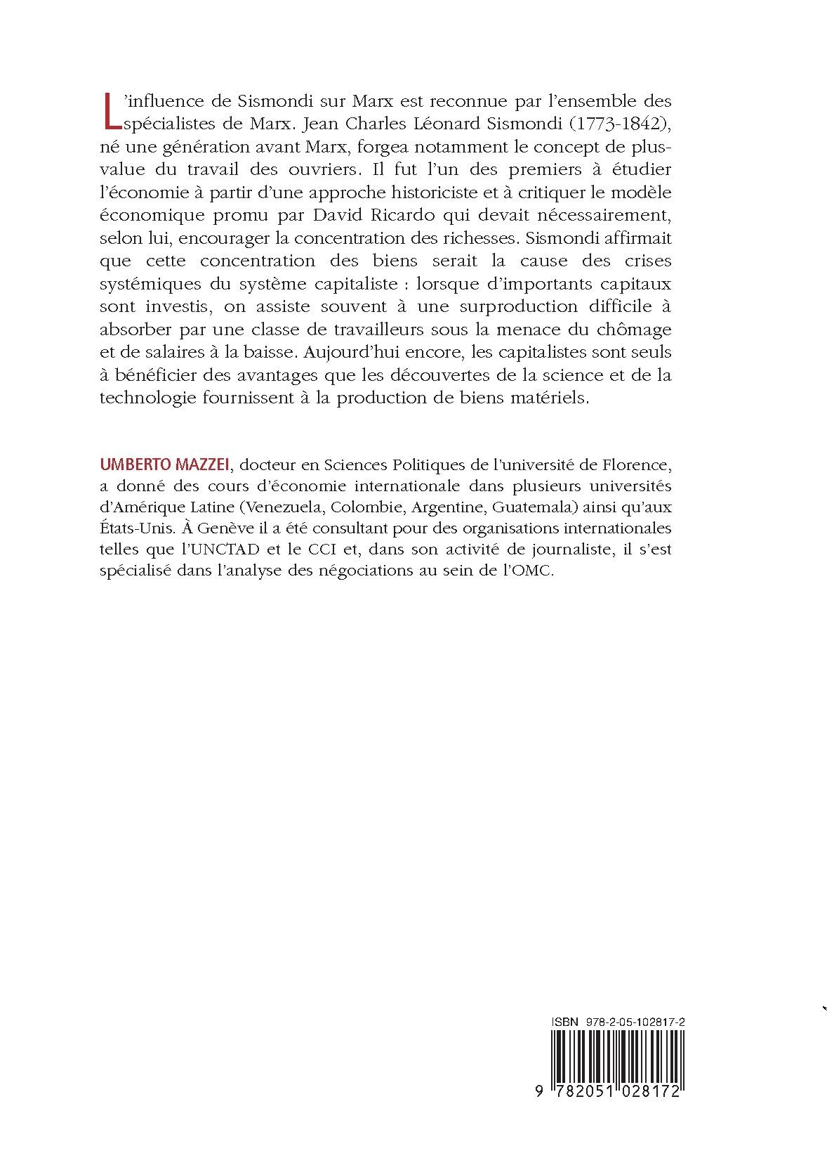 L’influence de Sismondi sur Marx est reconnue par l’ensemble des spécialistes de Marx. Jean Charles Léonard Sismondi (1773-1842), né une génération avant Marx, forgea notamment le concept de plus-value du travail des ouvriers. Il fut l’un des premiers à étudier l’économie à partir d’une approche historiciste et à critiquer le modèle économique promu par David Ricardo qui devait nécessairement, selon lui, encourager la concentration des richesses. Sismondi affirmait que cette concentration des biens serait la cause des crises systémiques du système capitaliste : lorsque d’importants capitaux sont investis, on assiste souvent à une surproduction difficile à absorber par une classe de travailleurs sous la menace du chômage et de salaires à la baisse. Aujourd’hui encore, les capitalistes sont seuls à bénéficier des avantages que les découvertes de la science et de la technologie fournissent à la production de biens matériels.