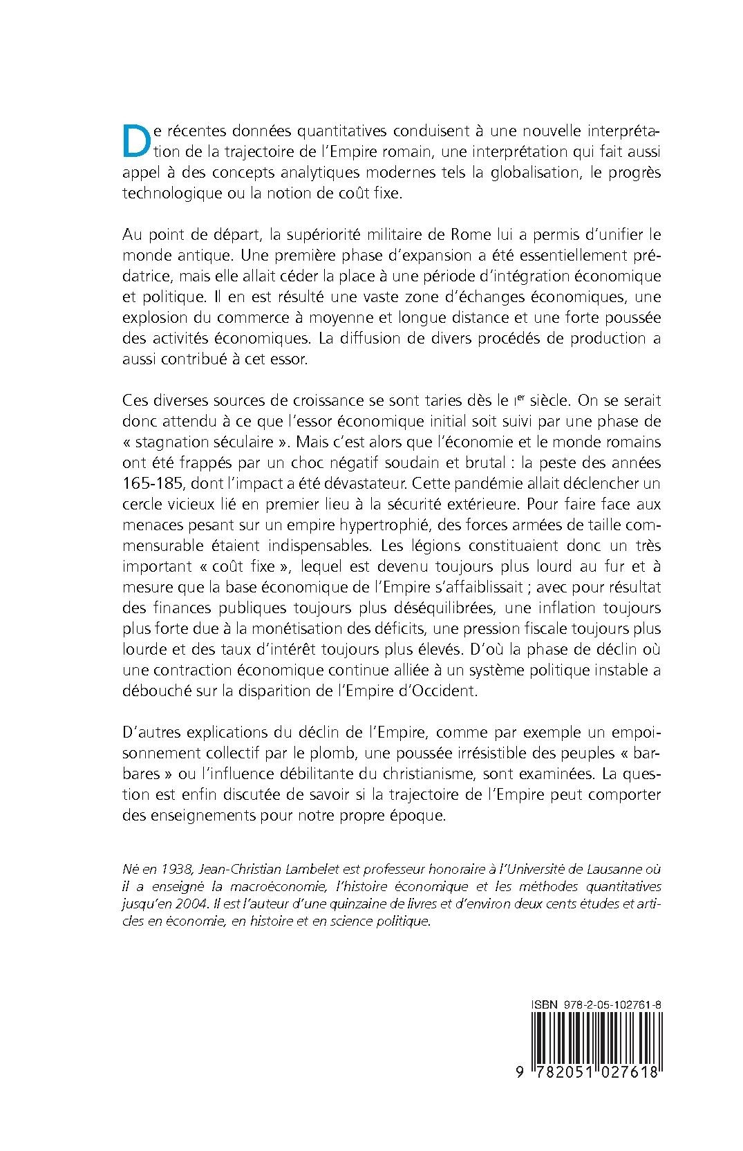 D’autres explications du déclin de l’Empire, comme par exemple un empoisonnement collectif par le plomb, une poussée irrésistible des peuples « barbares » ou l’influence débilitante du christianisme, sont examinées. La question est enfin discutée de savoir si la trajectoire de l’Empire peut comporter des enseignements pour notre propre époque.