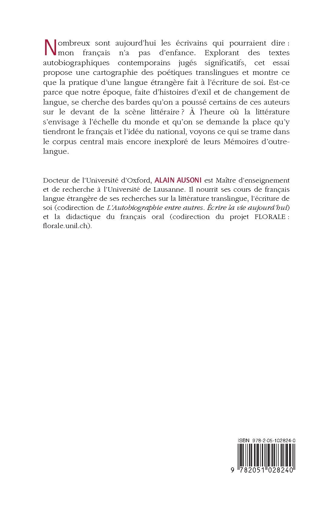 Nombreux sont aujourd’hui les écrivains qui pourraient dire : mon français n’a pas d’enfance. Explorant des textes autobiographiques contemporains jugés significatifs, cet essai propose une cartographie des poétiques translingues et montre ce que la pratique d’une langue étrangère fait à l’écriture de soi. Est-ce parce que notre époque, faite d’histoires d’exil et de changement de langue, se cherche des bardes qu’on a poussé certains de ces auteurs sur le devant de la scène littéraire ? À l’heure où la littérature s’envisage à l’échelle du monde et qu’on se demande la place qu’y tiendront le français et l’idée du national, voyons ce qui se trame dans le corpus central mais encore inexploré de leurs Mémoires d’outre-langue.