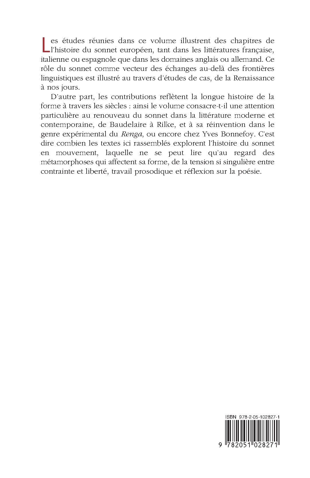 Les études réunies dans ce volume illustrent des chapitres de l’histoire du sonnet européen, tant dans les littératures française, italienne ou espagnole que dans les domaines anglais ou allemand. Ce rôle du sonnet comme vecteur des échanges au-delà des frontières linguistiques est illustré au travers d’études de cas, de la Renaissance à nos jours.