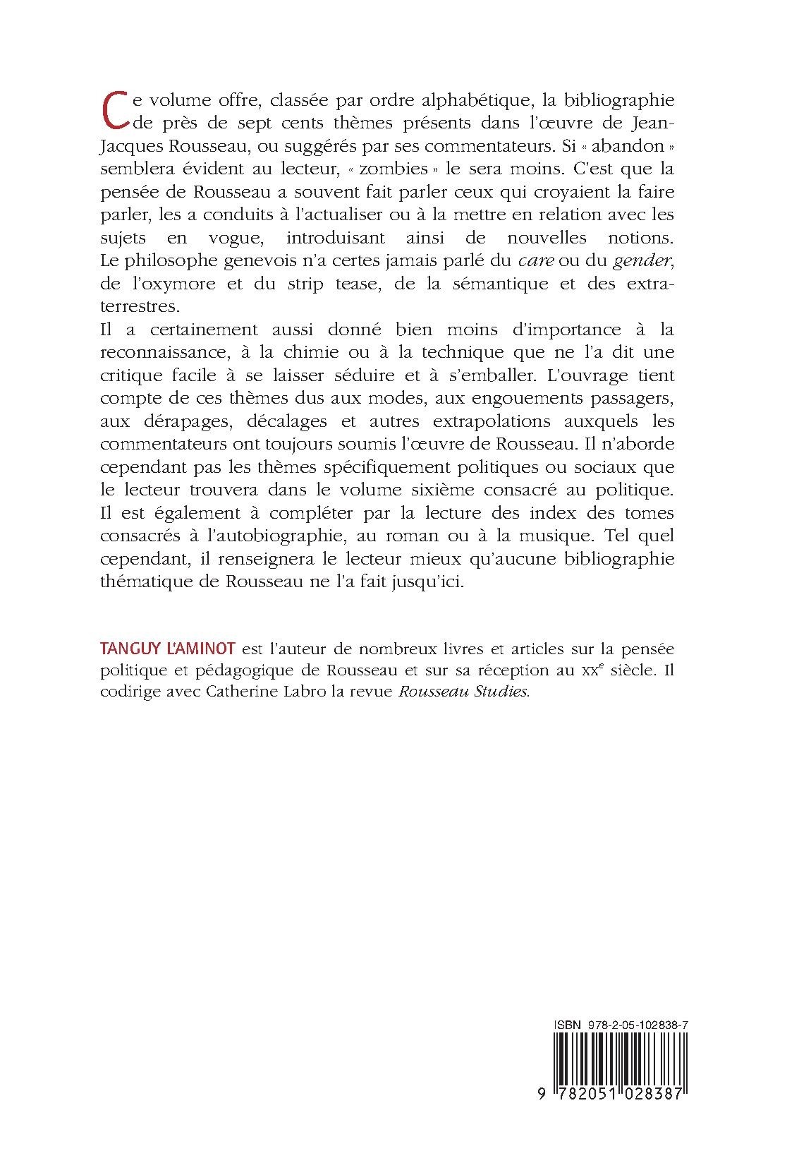 Ce volume offre, classée par ordre alphabétique, la bibliographie de près de sept cents thèmes présents dans l’oeuvre de Jean- Jacques Rousseau, ou suggérés par ses commentateurs. Si « abandon » semblera évident au lecteur, « zombies » le sera moins. C’est que la pensée de Rousseau a souvent fait parler ceux qui croyaient la faire parler, les a conduits à l’actualiser ou à la mettre en relation avec les sujets en vogue, introduisant ainsi de nouvelles notions. Le philosophe genevois n’a certes jamais parlé du care ou du gender, de l’oxymore et du strip tease, de la sémantique et des extraterrestres.