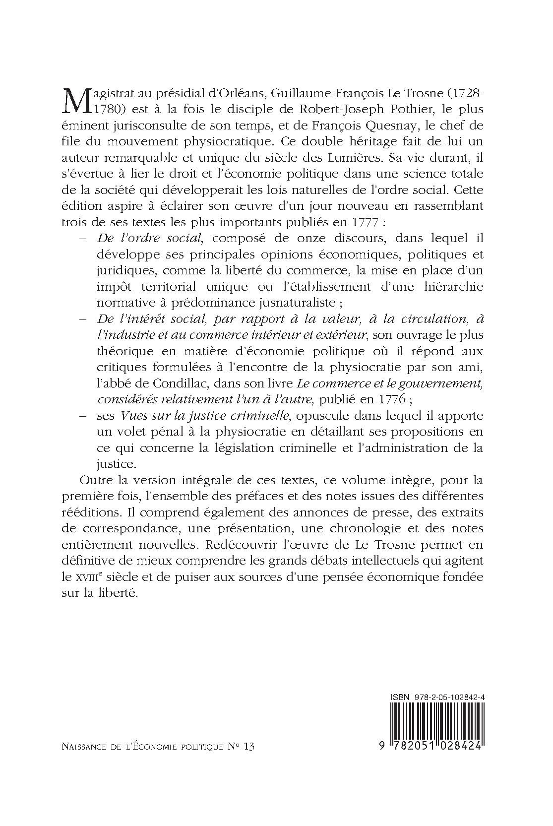 Magistrat au présidial d’Orléans, Guillaume-François Le Trosne (1728- 1780) est à la fois le disciple de Robert-Joseph Pothier, le plus éminent jurisconsulte de son temps, et de François Quesnay, le chef de file du mouvement physiocratique. Ce double héritage fait de lui un auteur remarquable et unique du siècle des Lumières. Sa vie durant, il s’évertue à lier le droit et l’économie politique dans une science totale de la société qui développerait les lois naturelles de l’ordre social. Cette édition aspire à éclairer son oeuvre d’un jour nouveau en rassemblant trois de ses textes les plus importants publiés en 1777 :
