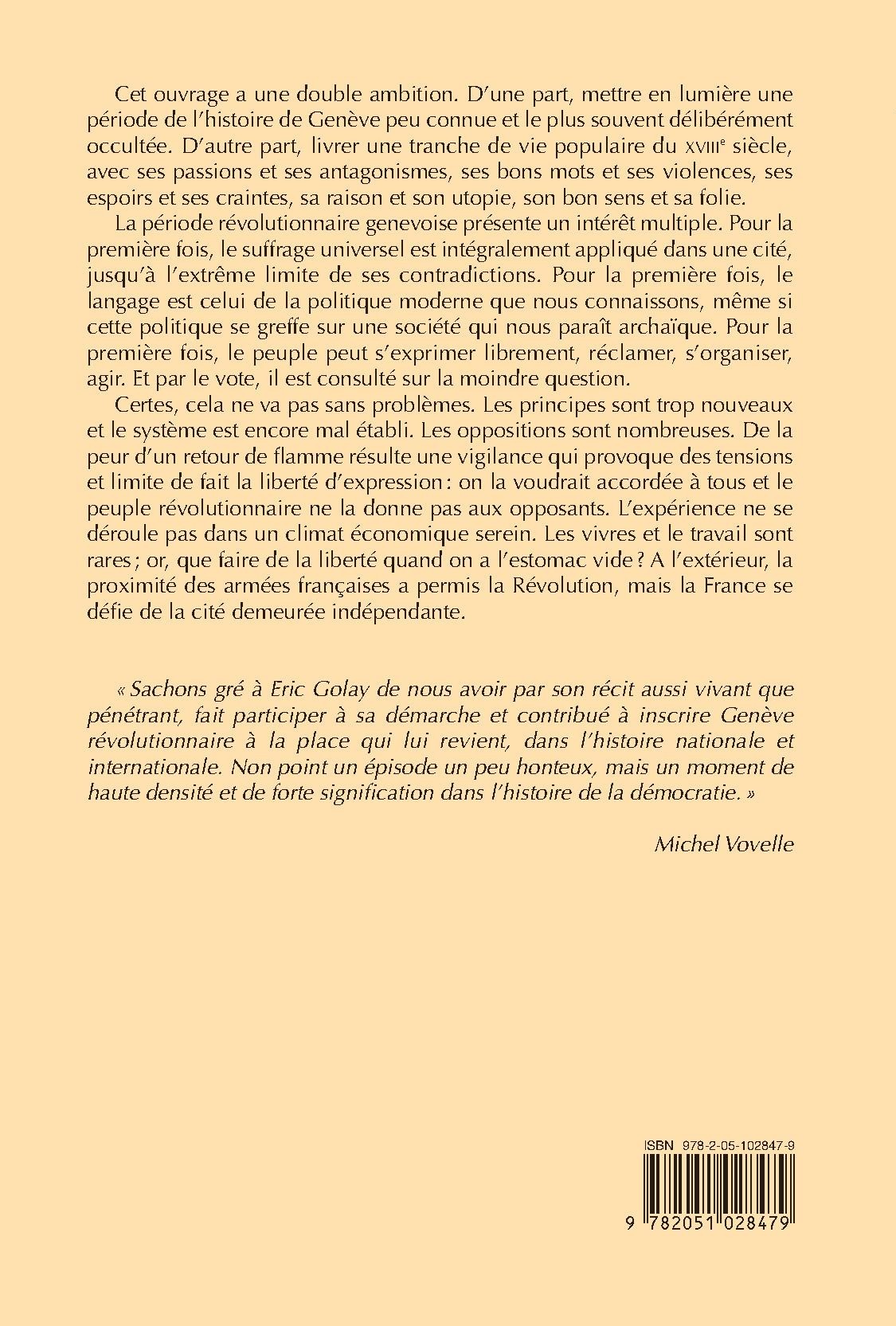 « Sachons gré à Eric Golay de nous avoir par son récit aussi vivant que pénétrant, fait participer à sa démarche et contribué à inscrire Genève révolutionnaire à la place qui lui revient, dans l’histoire nationale et internationale. Non point un épisode un peu honteux, mais un moment de haute densité et de forte signification dans l’histoire de la démocratie. » Michel Vovelle
