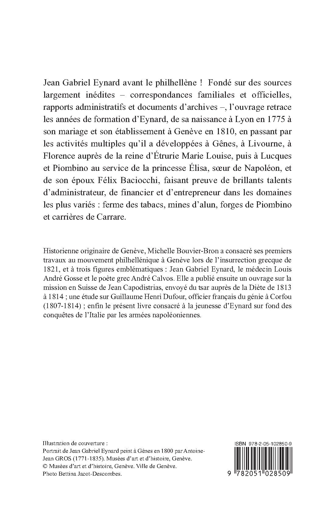 Jean Gabriel Eynard avant le philhellène ! Fondé sur des sources largement inédites – correspondances familiales et officielles, rapports administratifs et documents d’archives –, l’ouvrage retrace les années de formation d’Eynard, de sa naissance à Lyon en 1775 à son mariage et son établissement à Genève en 1810, en passant par les activités multiples qu’il a développées à Gênes, à Livourne, à Florence auprès de la reine d’Étrurie Marie Louise, puis à Lucques et Piombino au service de la princesse Élisa, soeur de Napoléon, et de son époux Félix Baciocchi, faisant preuve de brillants talents d’administrateur, de financier et d’entrepreneur dans les domaines les plus variés: ferme des tabacs, mines d’alun, forges de Piombino et carrières de Carrare.