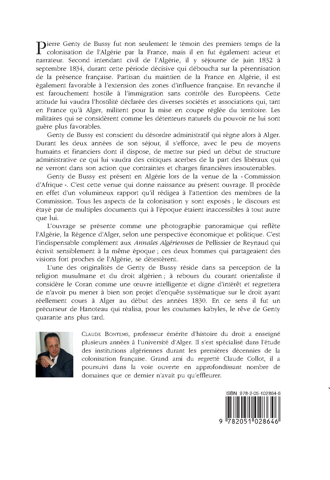 Genty de Bussy est conscient du désordre administratif qui règne alors à Alger. Durant les deux années de son séjour, il s’efforce, avec le peu de moyens humains et financiers dont il dispose, de mettre sur pied un début de structure administrative ce qui lui vaudra des critiques acerbes de la part des libéraux qui ne verront dans son action que contraintes et charges financières insoutenables. Genty de Bussy est présent en Algérie lors de la venue de la « Commission d’Afrique ». C’est cette venue qui donne naissance au présent ouvrage. Il procède en effet d’un volumineux rapport qu’il rédigea à l’attention des membres de la Commission. Tous les aspects de la colonisation y sont exposés ; le discours est étayé par de multiples documents qui à l’époque étaient inaccessibles à tout autre que lui.