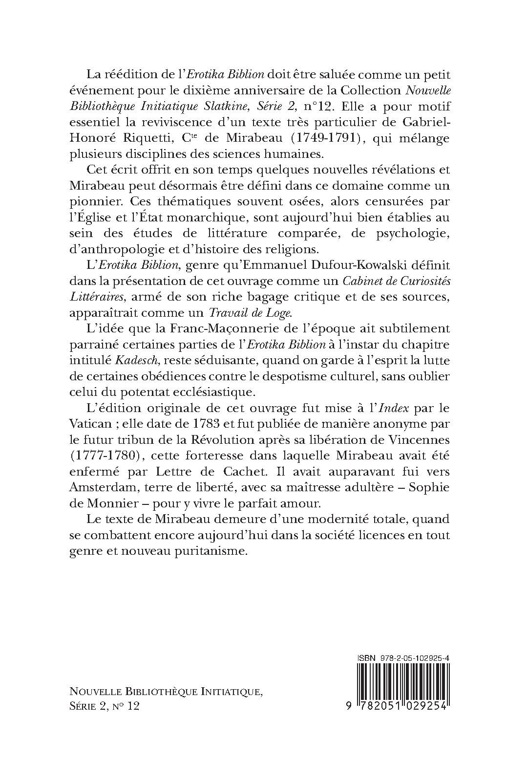 La réédition de l’Erotika Biblion doit être saluée comme un petit événement pour le dixième anniversaire de la Collection Nouvelle Bibliothèque Initiatique Slatkine, Série 2, n°12. Elle a pour motif essentiel la reviviscence d’un texte très particulier de Gabriel- Honoré Riquetti, Cte de Mirabeau (1749-1791), qui mélange plusieurs disciplines des sciences humaines.