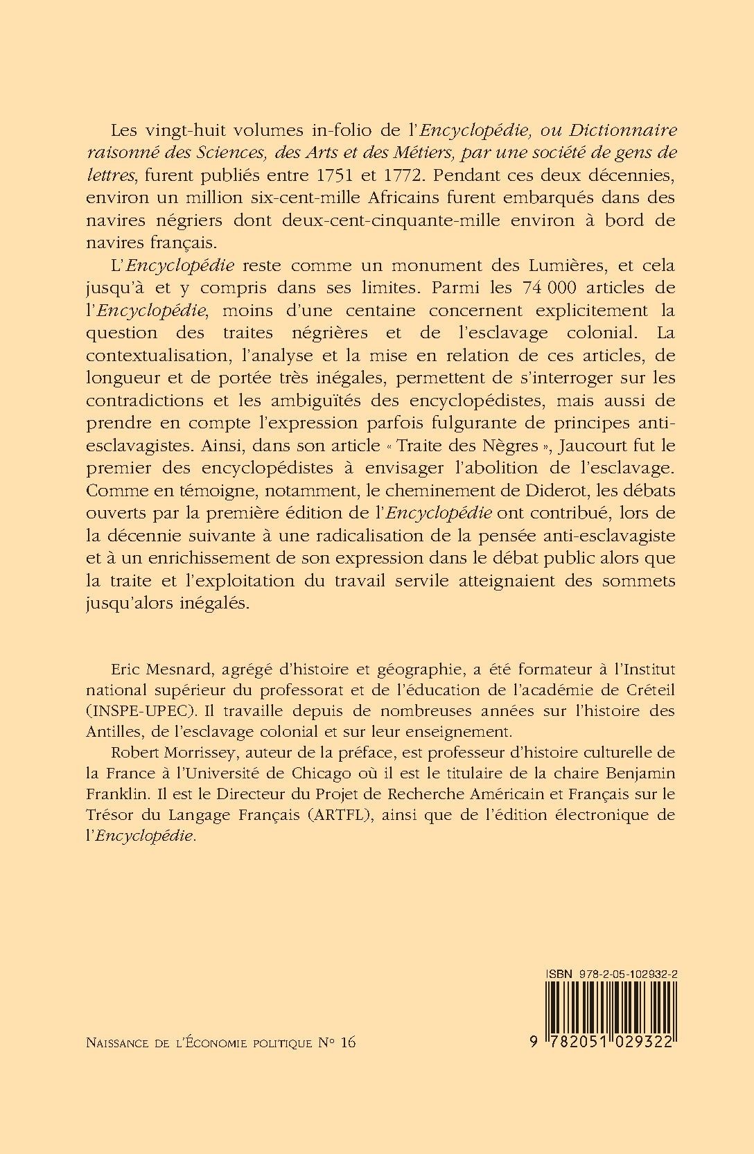 L’Encyclopédie reste comme un monument des Lumières, et cela jusqu’à et y compris dans ses limites. Parmi les 74 000 articles de l’Encyclopédie, moins d’une centaine concernent explicitement la question des traites négrières et de l’esclavage colonial. La contextualisation, l’analyse et la mise en relation de ces articles, de longueur et de portée très inégales, permettent de s’interroger sur les contradictions et les ambiguïtés des encyclopédistes, mais aussi de prendre en compte l’expression parfois fulgurante de principes antiesclavagistes. Ainsi, dans son article « Traite des Nègres », Jaucourt fut le premier des encyclopédistes à envisager l’abolition de l’esclavage. Comme en témoigne, notamment, le cheminement de Diderot, les débats ouverts par la première édition de l’Encyclopédie ont contribué, lors de la décennie suivante à une radicalisation de la pensée anti-esclavagiste et à un enrichissement de son expression dans le débat public alors que la traite et l’exploitation du travail servile atteignaient des sommets jusqu’alors inégalés.