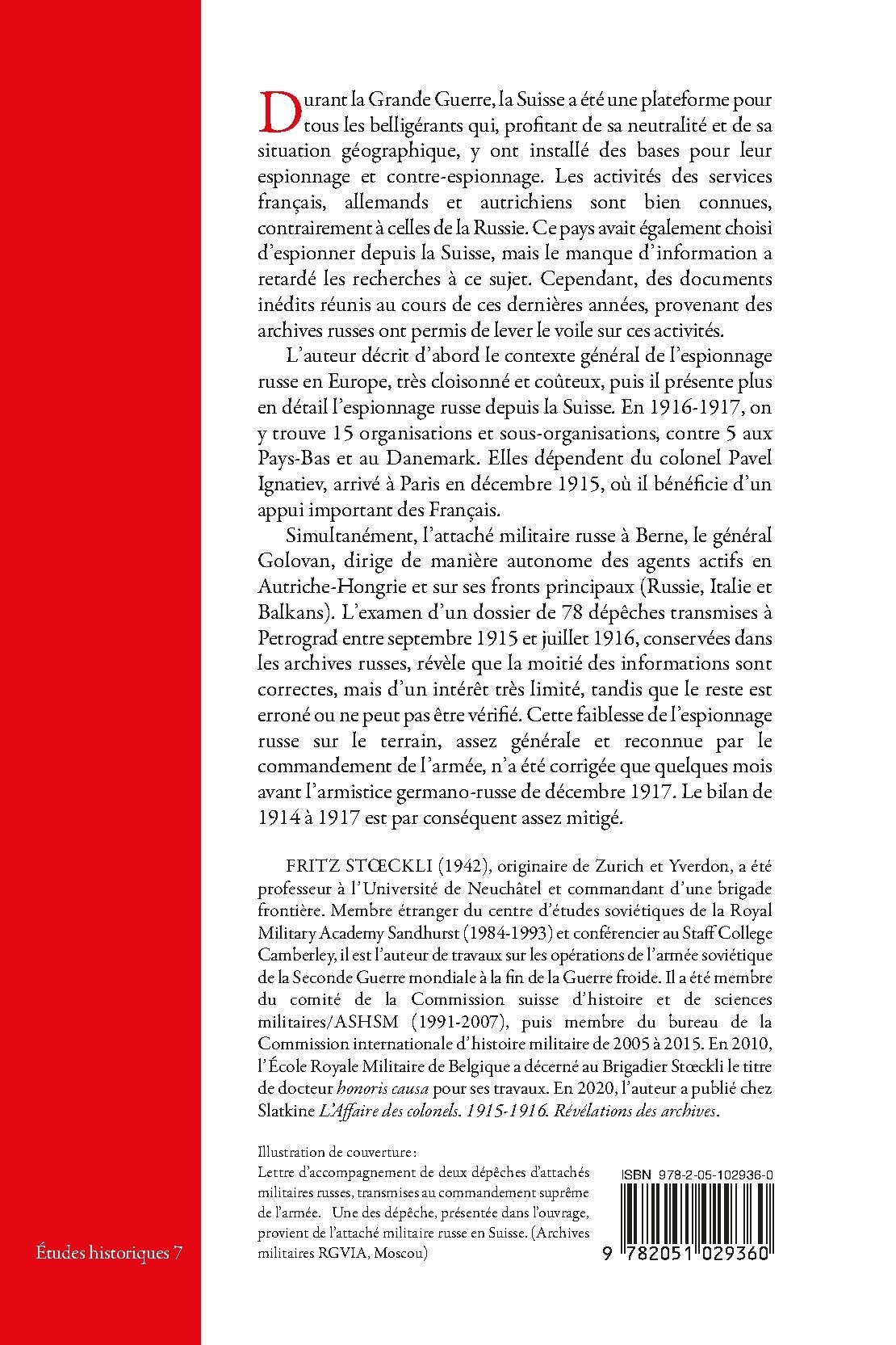FRITZ STŒCKLI (1942), originaire de Zurich et Yverdon, a été professeur à l’Université de Neuchâtel et commandant d’une brigade frontière. Membre étranger du centre d’études soviétiques de la Royal Military Academy Sandhurst (1984-1993) et conférencier au Staff College Camberley, il est l’auteur de travaux sur les opérations de l’armée soviétique de la Seconde Guerre mondiale à la fin de la Guerre froide. Il a été membre du comité de la Commission suisse d’histoire et de sciences militaires/ASHSM (1991-2007), puis membre du bureau de la Commission internationale d’histoire militaire de 2005 à 2015. En 2010, l’École Royale Militaire de Belgique a décerné au Brigadier Stœckli le titre de docteur honoris causa pour ses travaux. En 2020, l’auteur a publié chez Slatkine L’Affaire des colonels. 1915-1916. Révélations des archives.