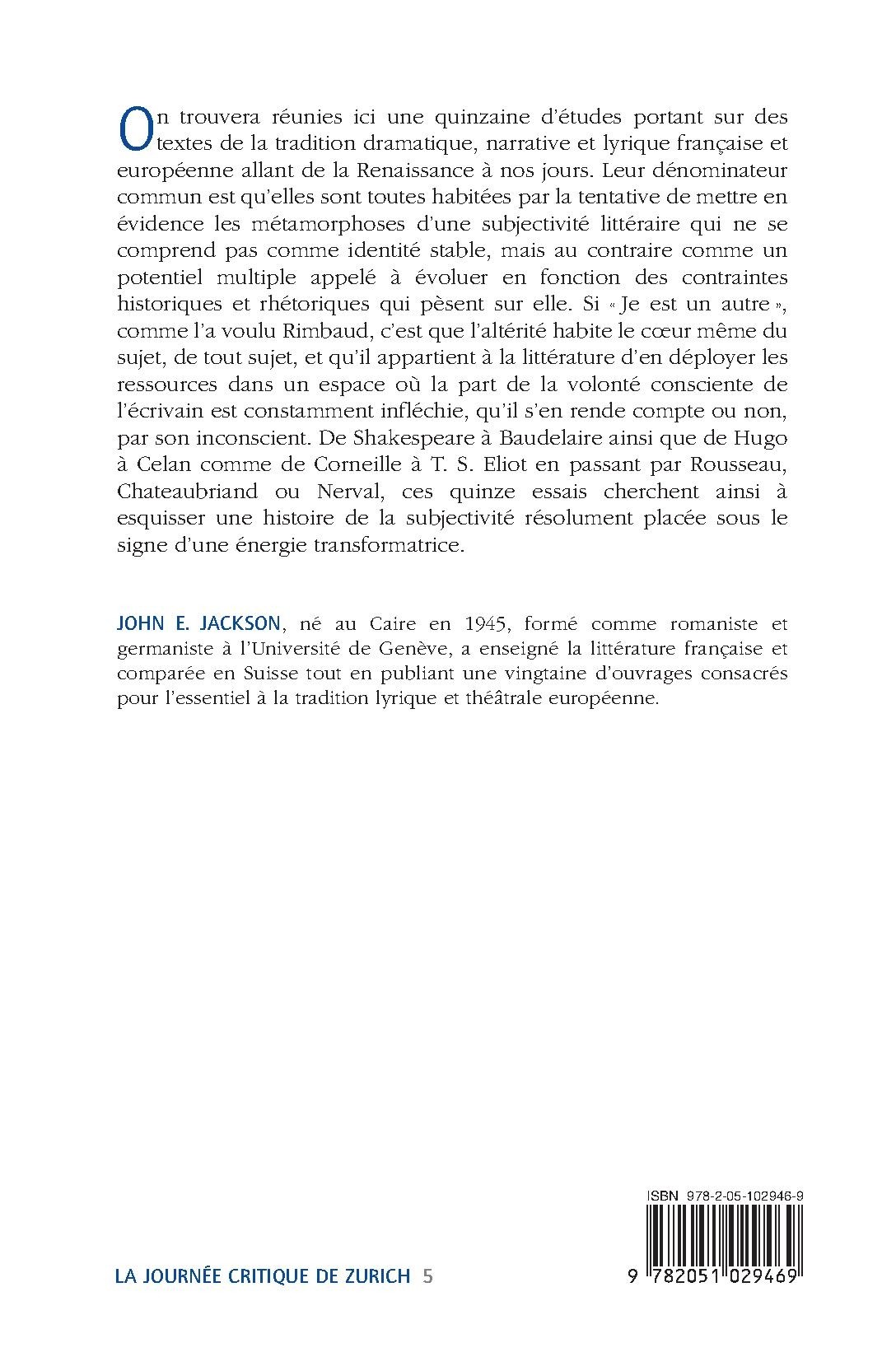 On trouvera réunies ici une quinzaine d’études portant sur des textes de la tradition dramatique, narrative et lyrique française et européenne allant de la Renaissance à nos jours. Leur dénominateur commun est qu’elles sont toutes habitées par la tentative de mettre en évidence les métamorphoses d’une subjectivité littéraire qui ne se comprend pas comme identité stable, mais au contraire comme un potentiel multiple appelé à évoluer en fonction des contraintes historiques et rhétoriques qui pèsent sur elle. Si « Je est un autre », comme l’a voulu Rimbaud, c’est que l’altérité habite le coeur même du sujet, de tout sujet, et qu’il appartient à la littérature d’en déployer les ressources dans un espace où la part de la volonté consciente de l’écrivain est constamment infléchie, qu’il s’en rende compte ou non, par son inconscient. De Shakespeare à Baudelaire ainsi que de Hugo à Celan comme de Corneille à T. S. Eliot en passant par Rousseau, Chateaubriand ou Nerval, ces quinze essais cherchent ainsi à esquisser une histoire de la subjectivité résolument placée sous le signe d’une énergie transformatrice.