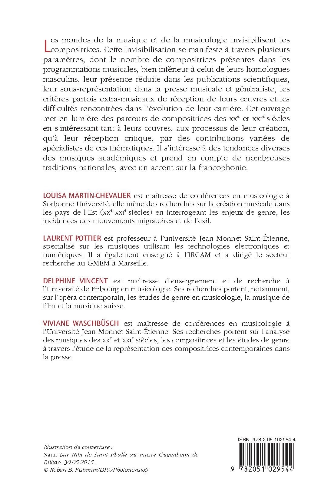 Les mondes de la musique et de la musicologie invisibilisent les compositrices. Cette invisibilisation se manifeste à travers plusieurs paramètres, dont le nombre de compositrices présentes dans les programmations musicales, bien inférieur à celui de leurs homologues masculins, leur présence réduite dans les publications scientifiques, leur sous-représentation dans la presse musicale et généraliste, les critères parfois extra-musicaux de réception de leurs œuvres et les difficultés rencontrées dans l’évolution de leur carrière. Cet ouvrage met en lumière des parcours de compositrices des XXe et XXIe siècles en s’intéressant tant à leurs œuvres, aux processus de leur création, qu’à leur réception critique, par des contributions variées de spécialistes de ces thématiques. Il s’intéresse à des tendances diverses des musiques académiques et prend en compte de nombreuses traditions nationales, avec un accent sur la francophonie.